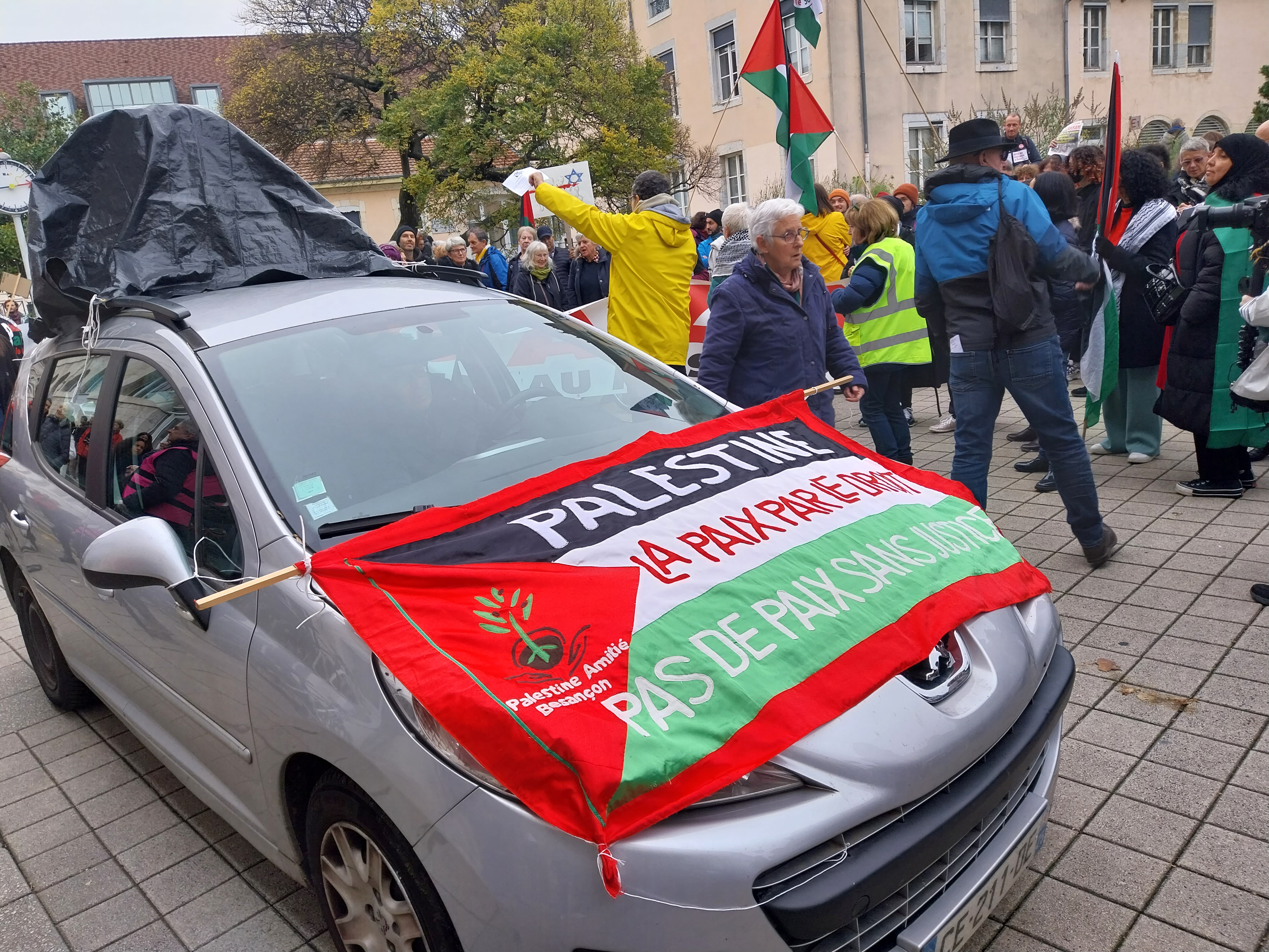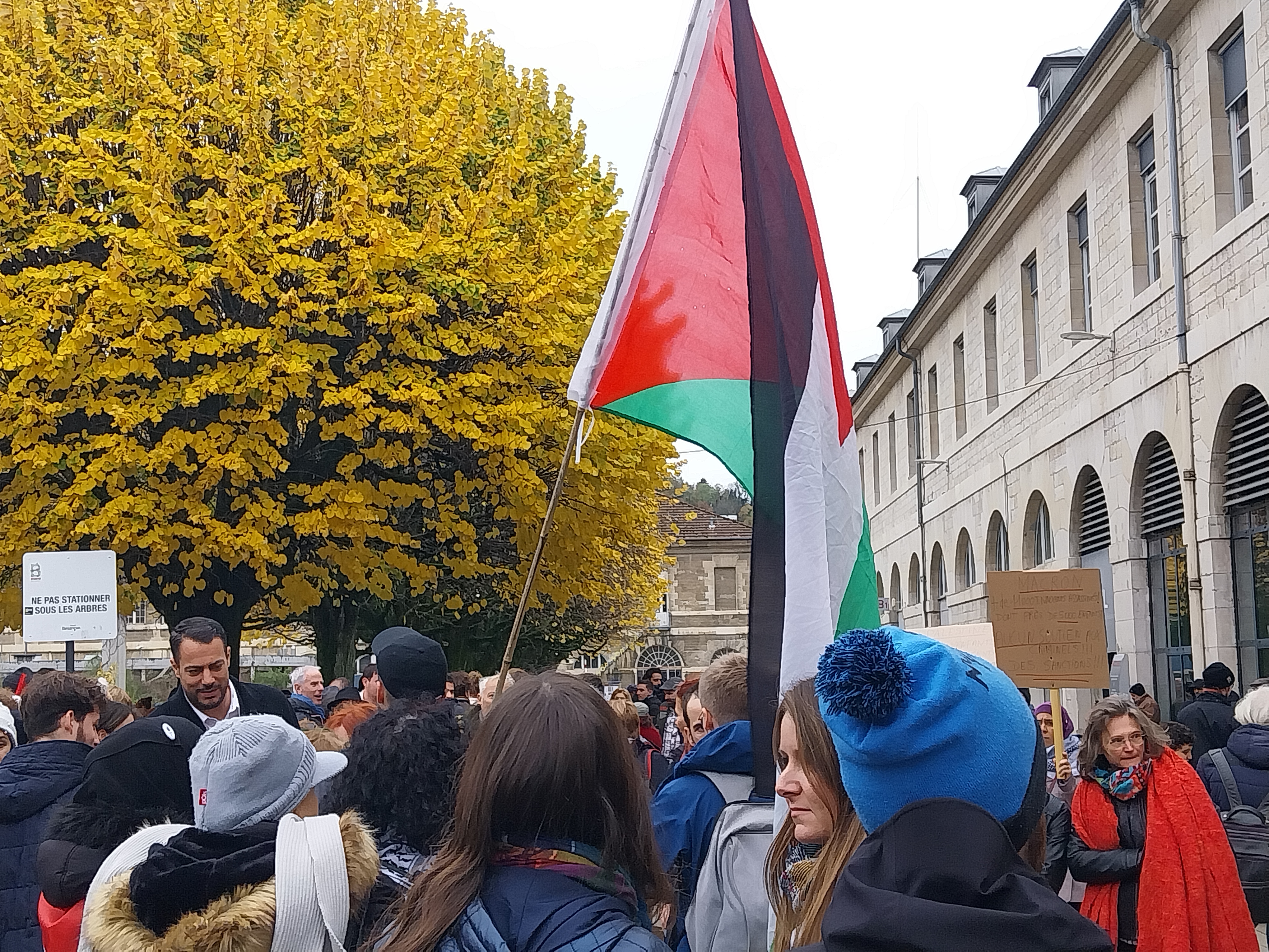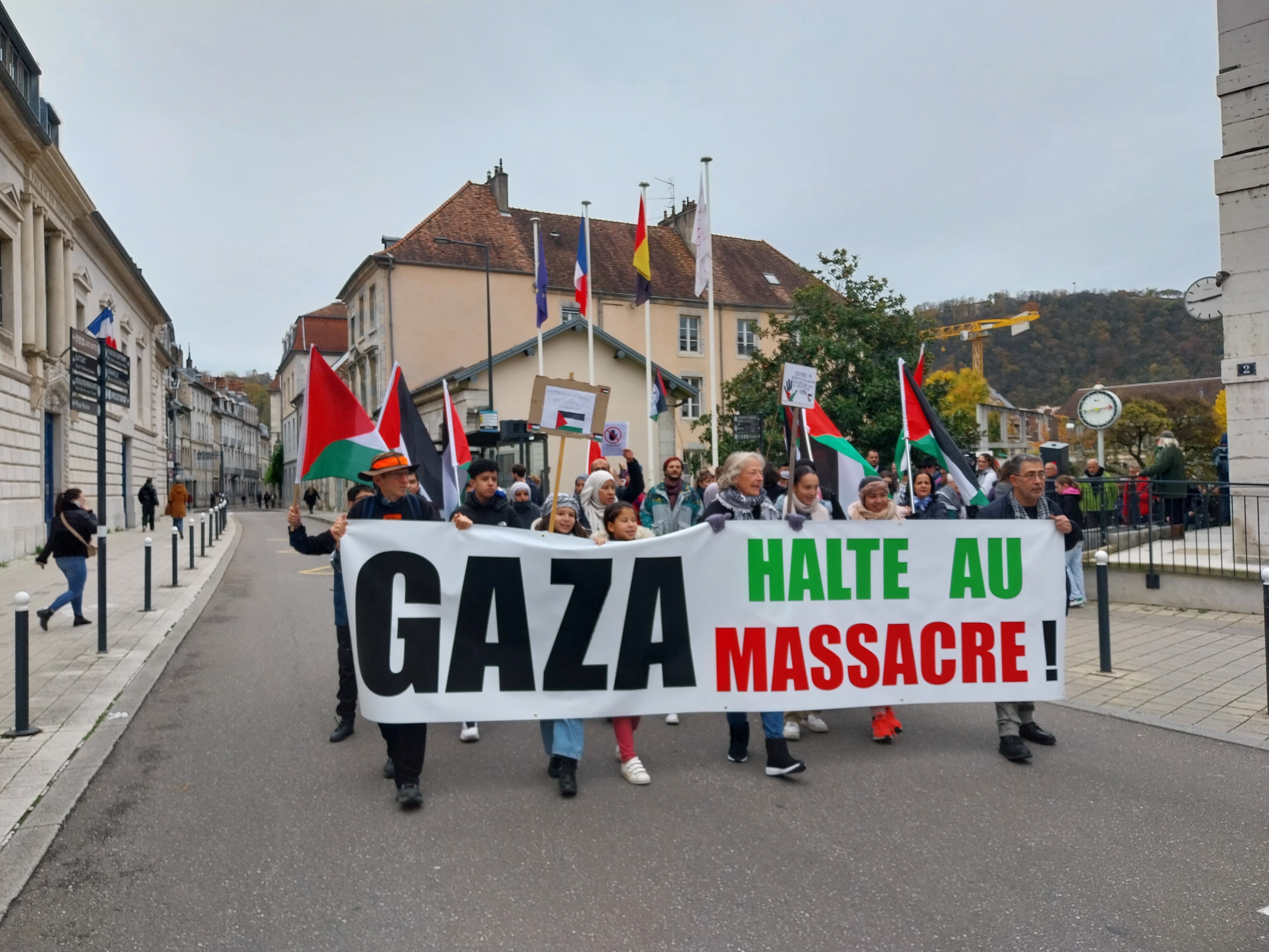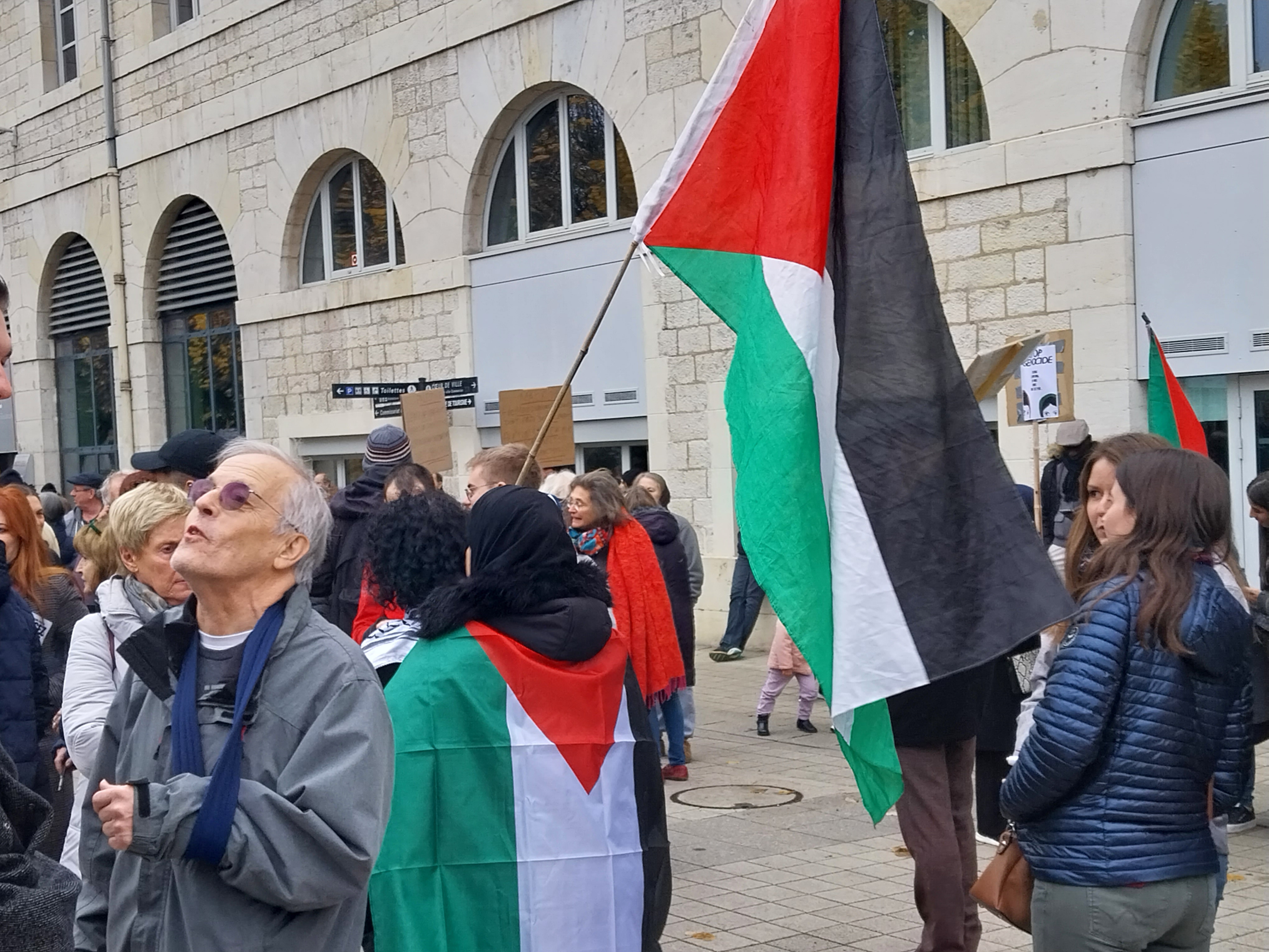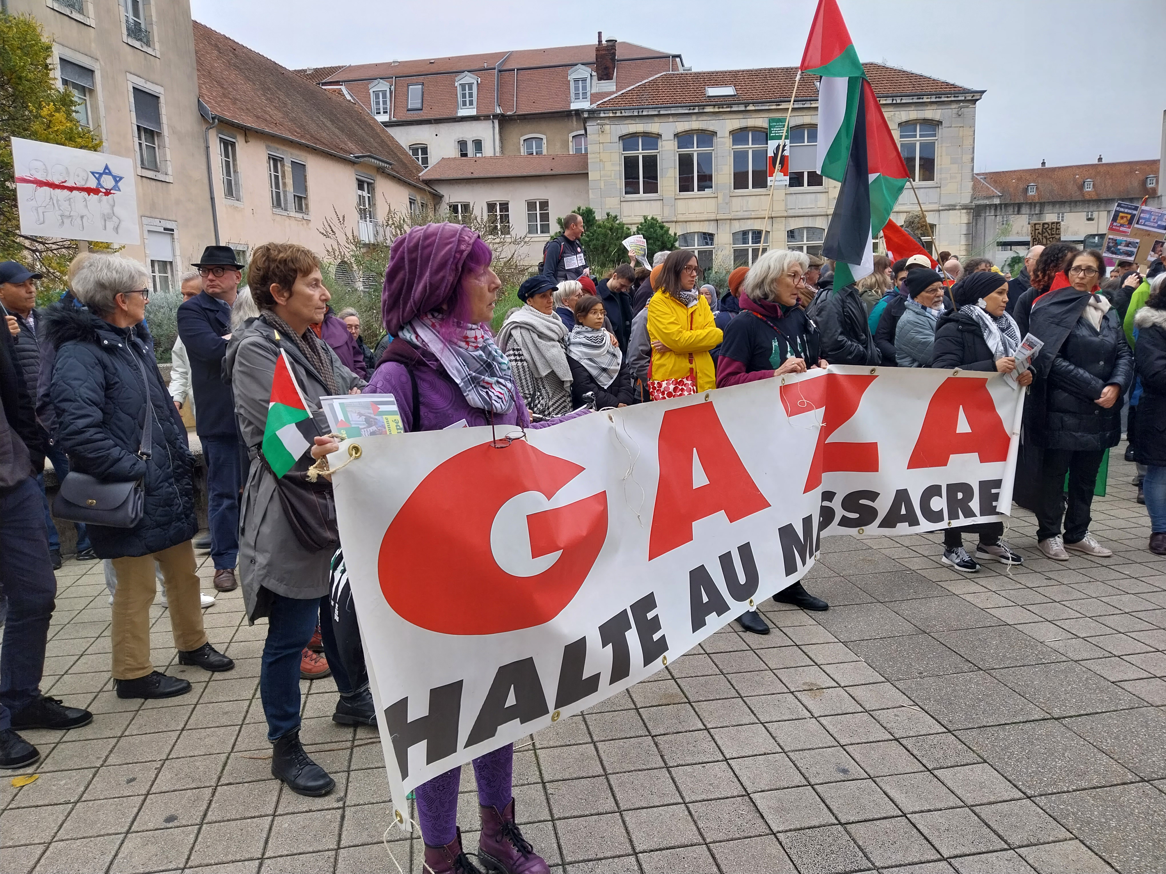 Environ 900 personnes se sont rassemblées ce samedi après-midi, à Besançon, sur la place des droits de l’Homme. A l’appel d’une vingtaine d’organisation, ces manifestants, venus le plus souvent en famille, demandent « un cessez-le-feu à Gaza et la fin du déplacement forcé des population ». Parmi les signataires de ce rassemblement : Palestine Amitié, France Palestine Solidarité, la Ligue des Droits de l’Homme, le MRAP, ATTAC, … mais également des syndicats et des partis politiques de gauche.