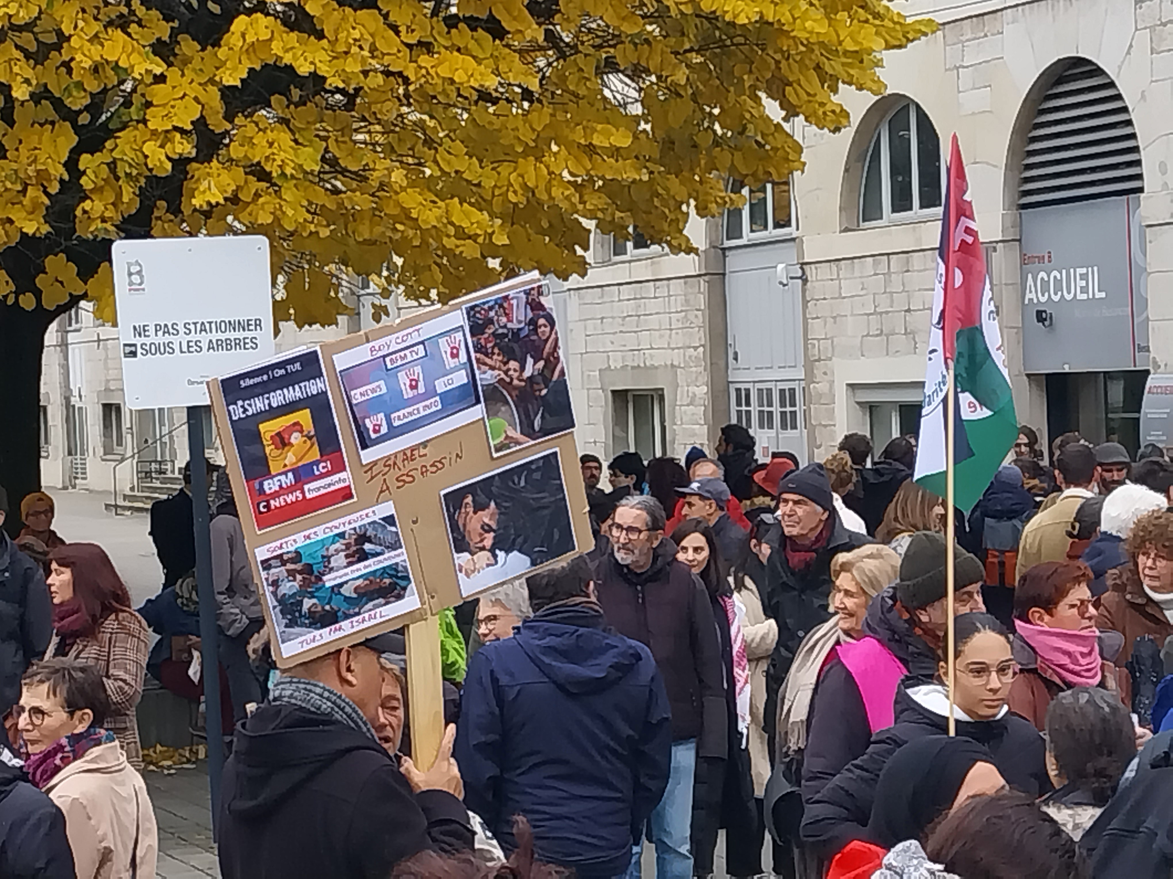 Dans leur propos introductif unitaire, les organisateurs ont demandé la fin des bombardements, du blocus, qui empêche la distribution de la nourriture et la diffusion des systèmes de communication. Tout en rappelant les violences contre les civiles, le collectif précise que « chaque vie compte ». Il est demandé « une paix juste et durable », qui se conjuguera avec « l’arrêt de la colonisation, la fin de l’occupation israélienne et de la Cisjordanie et le respect des libertés démocratiques ».