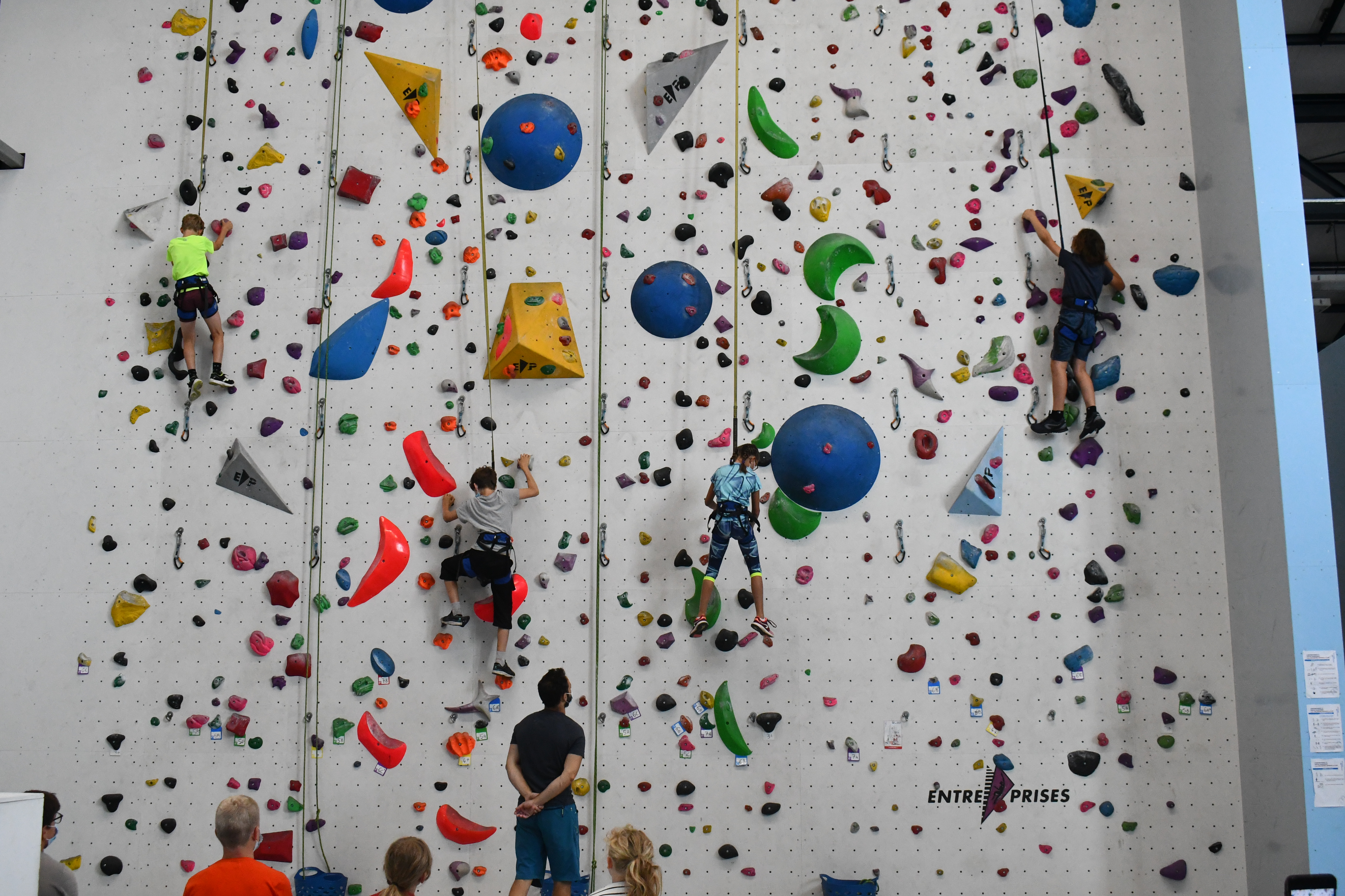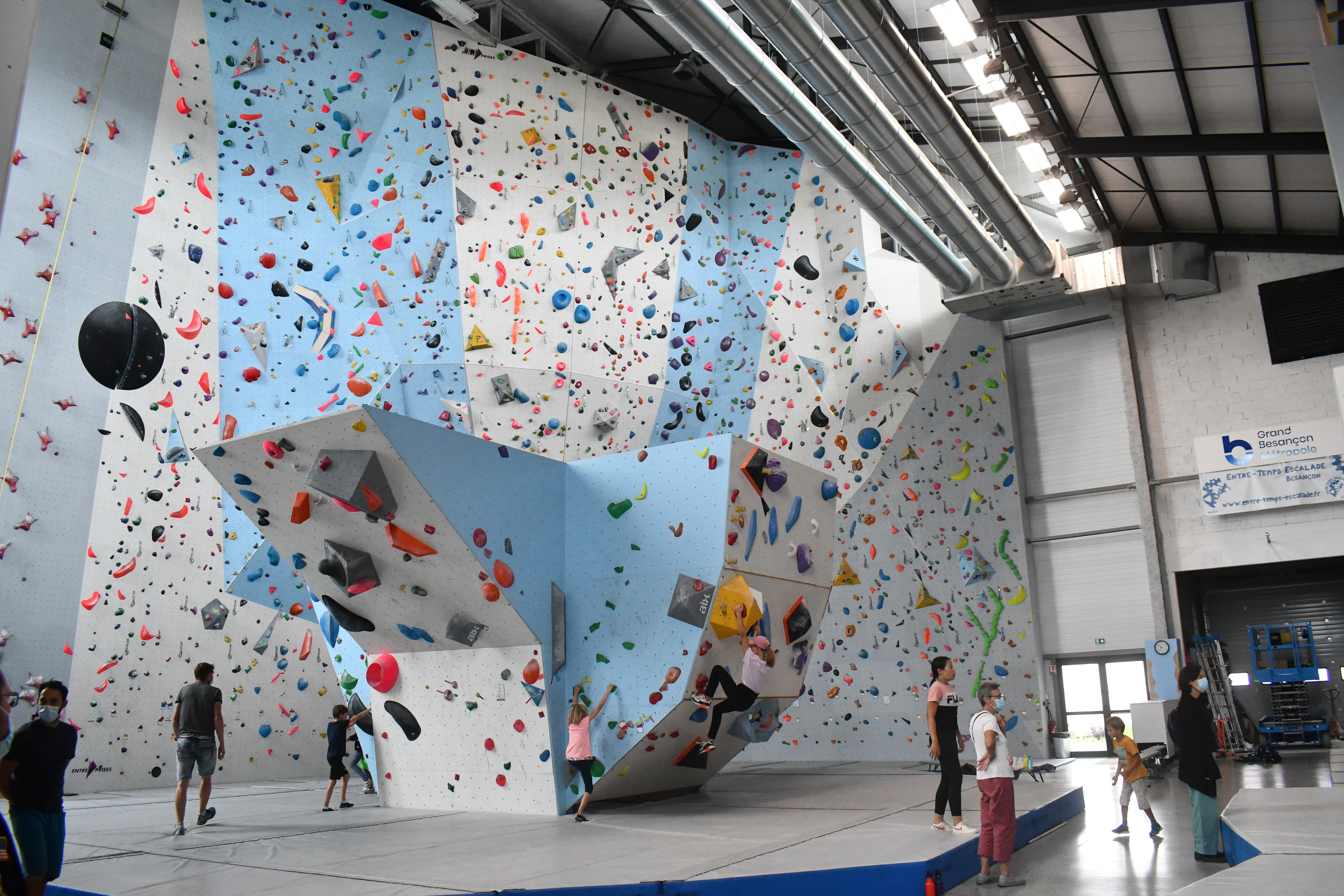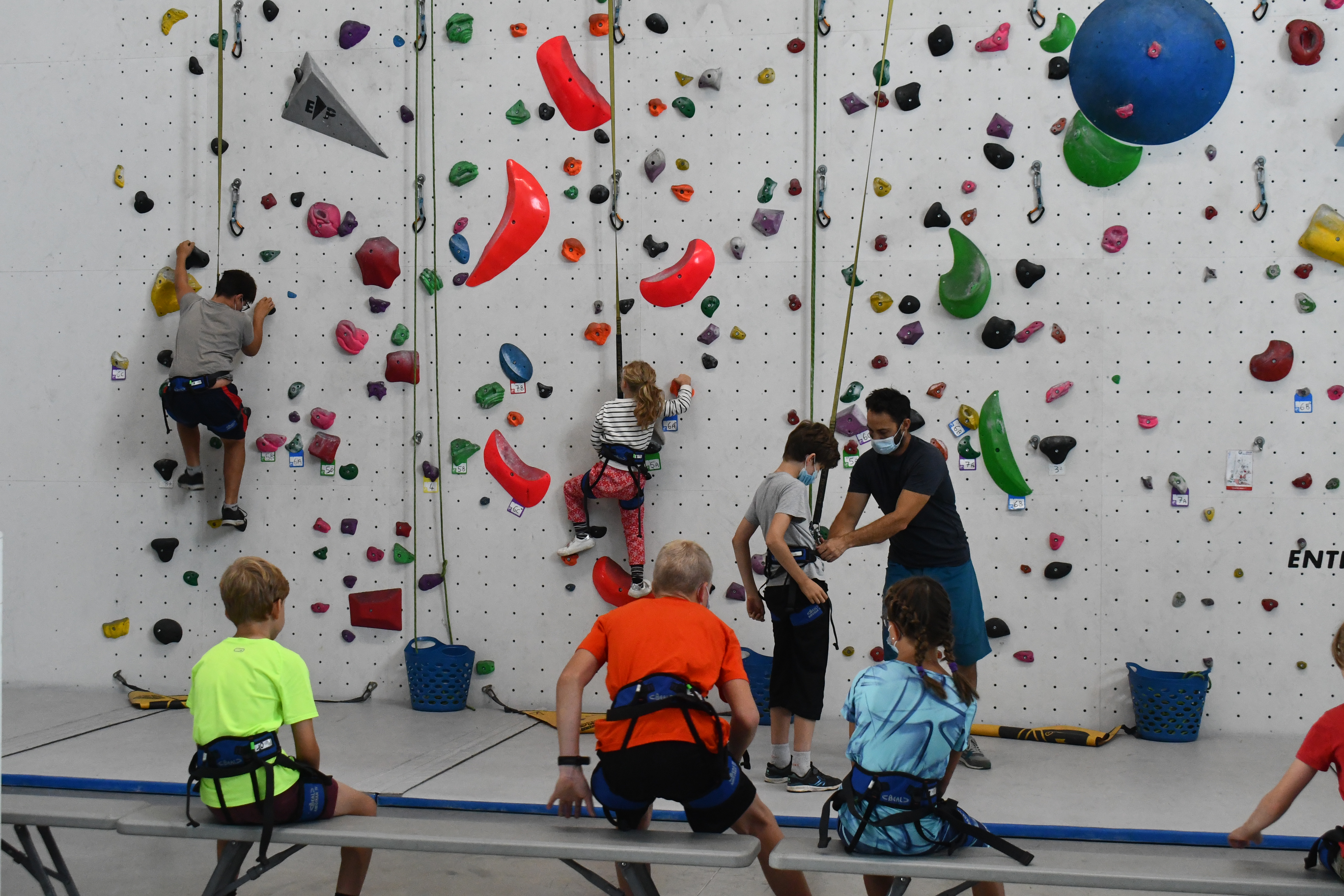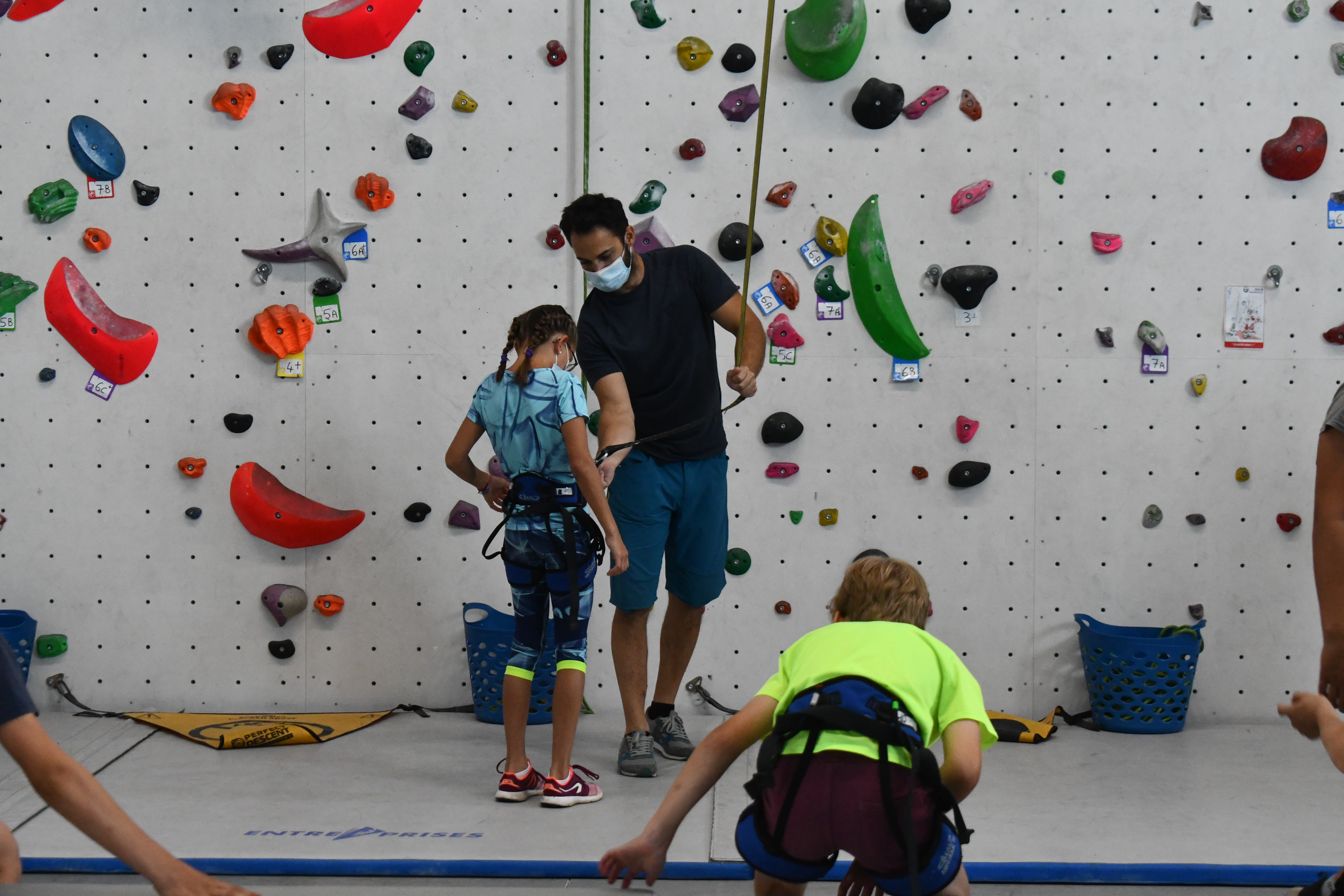 Ils sont une dizaine, ils ont entre huit et quatorze ans, et quatre jours par semaine depuis le 7 juillet dernier, ils viennent grimper les murs de la salle Marie Paradis à Besançon. En arrivant, Loïc Pagand, le responsable équipement de l’association Entre-Temps se livre à un petit brief d’explication pendant une dizaine de minutes, afin que la séance se déroule au mieux et que les enfants puissent être autonomes sur leur structure. « Après quelques explications, on les prépare en leur mettant un baudrier. Après ils peuvent commencer à faire des voies, sur des murs allant jusqu’à 9 mètres, avec des enrouleurs automatiques. Ils sont attachés à des sangles, avec des stop-chute, ce qui fait que dès qu’ils lâchent, ils redescendent tranquillement » indique Loïc Pagand. Enfin, en deuxième partie de séances, les enfants changent de structure. C’est un bloc bien moins haut, de 4 mètres à 4,5 mètres qu’ils doivent escalader, assuré par un épais tapis de réception placé en dessous, dans le but d’amortir la moindre chute qui surviendrait.