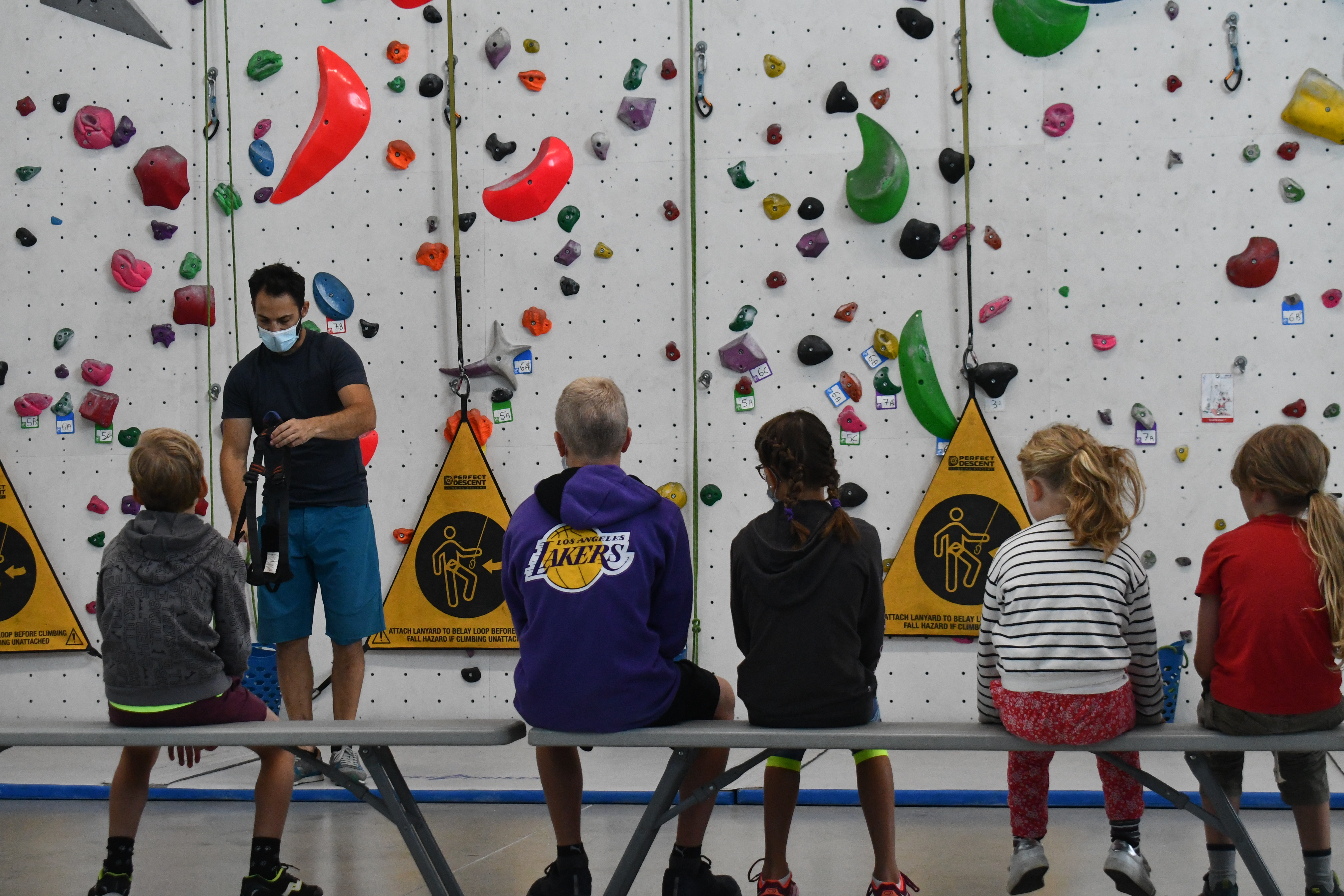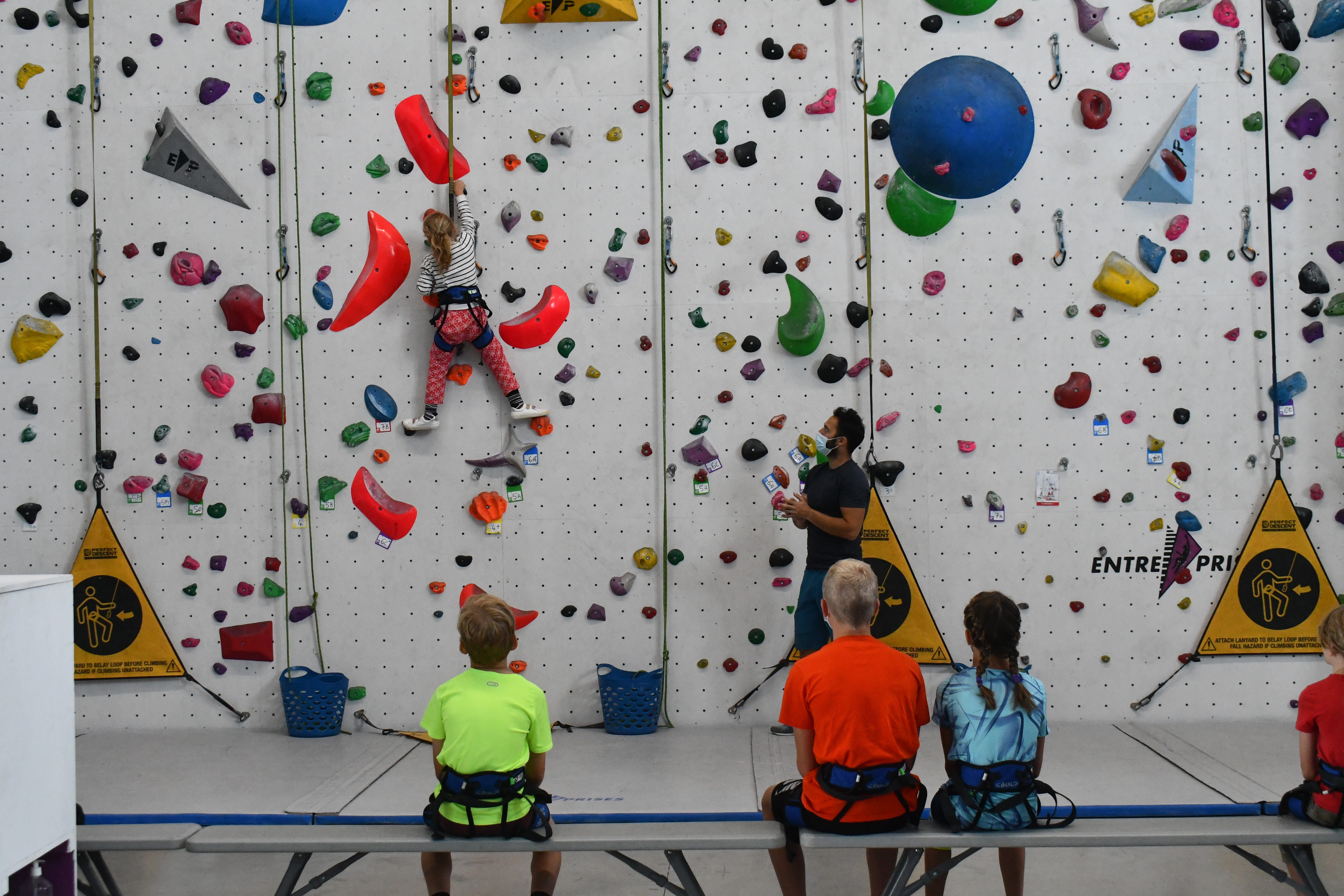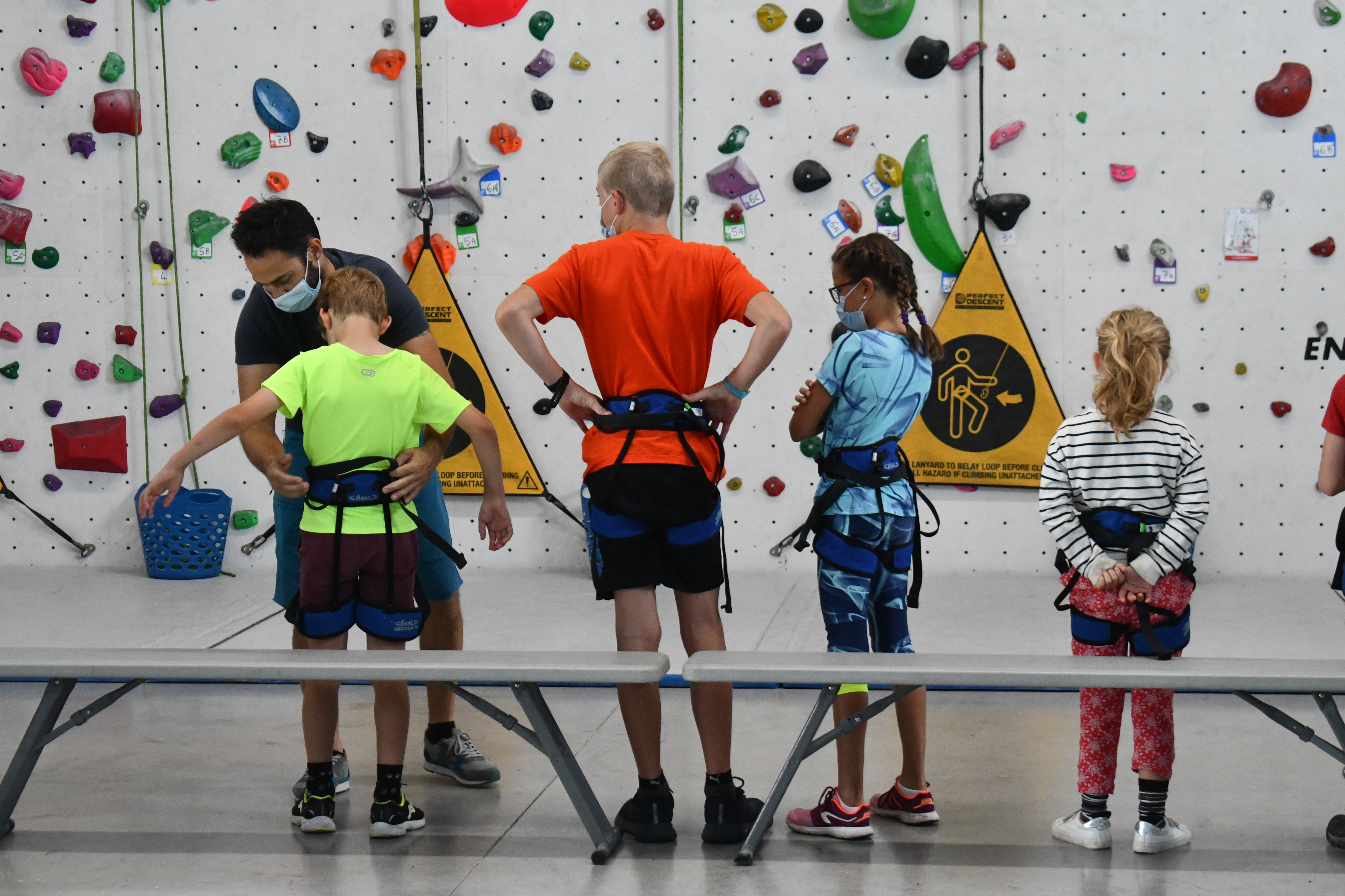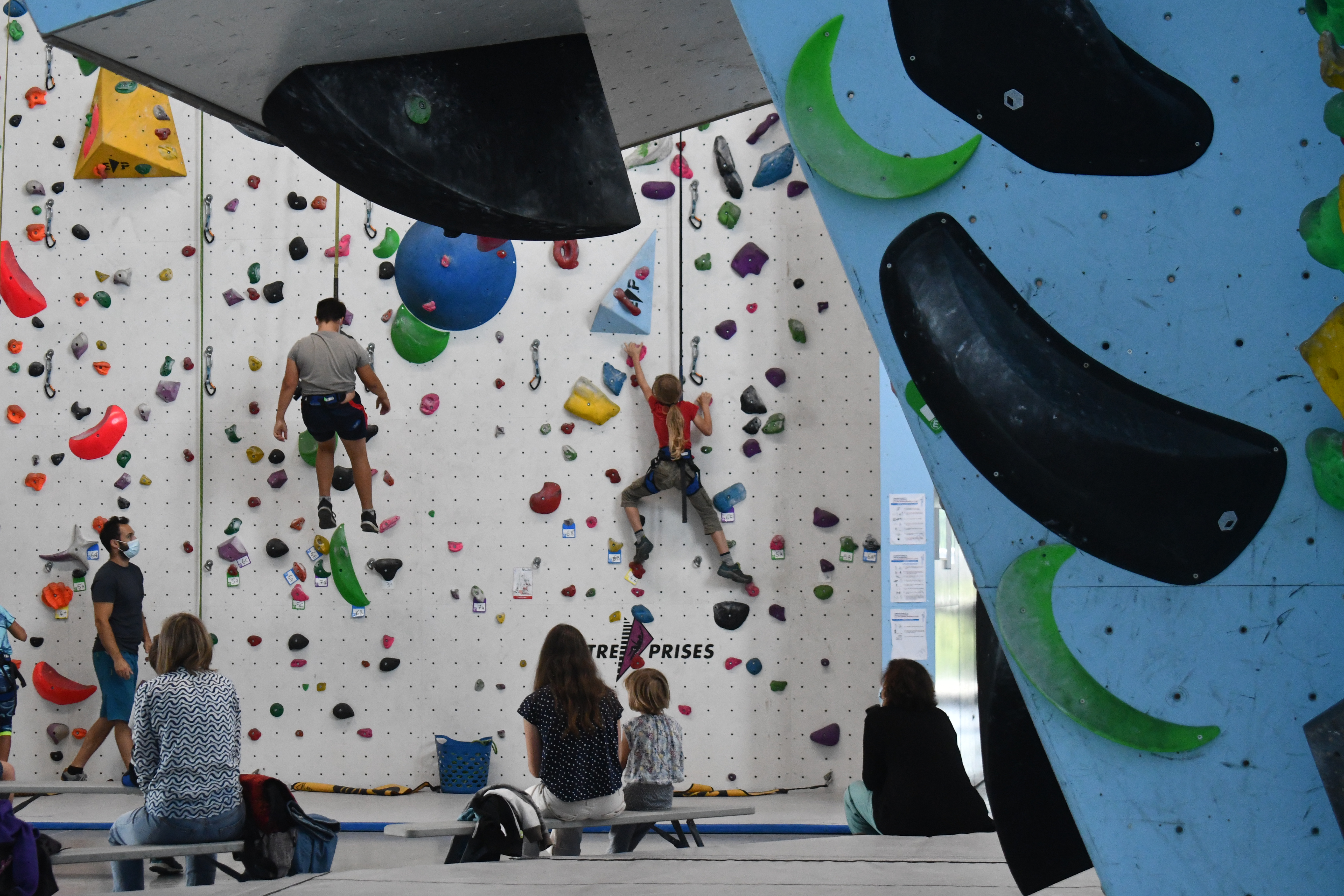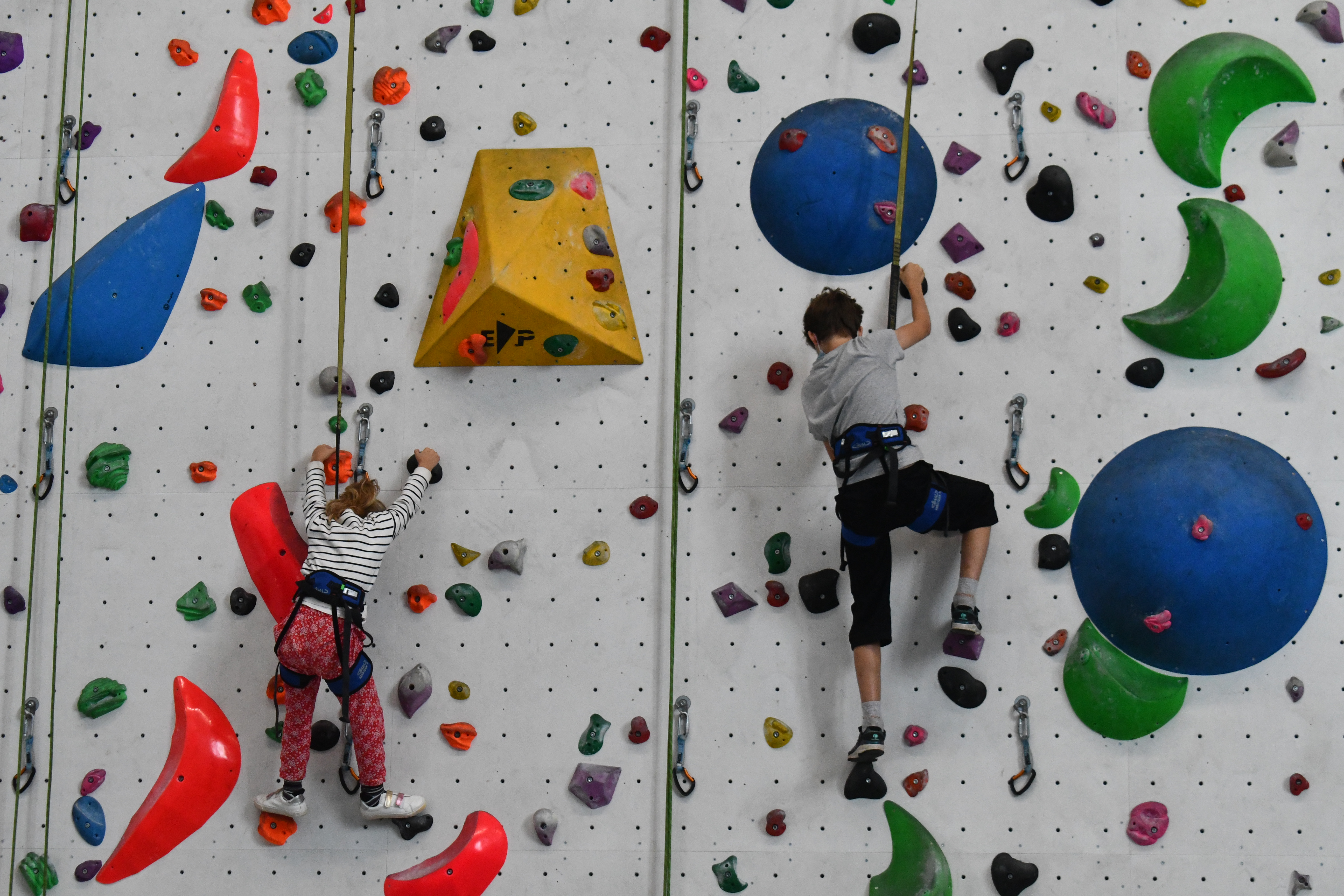 Ils sont une dizaine, ils ont entre huit et quatorze ans, et quatre jours par semaine depuis le 7 juillet dernier, ils viennent grimper les murs de la salle Marie Paradis à Besançon. En arrivant, Loïc Pagand, le responsable équipement de l’association Entre-Temps se livre à un petit brief d’explication pendant une dizaine de minutes, afin que la séance se déroule au mieux et que les enfants puissent être autonomes sur leur structure. « Après quelques explications, on les prépare en leur mettant un baudrier. Après ils peuvent commencer à faire des voies, sur des murs allant jusqu’à 9 mètres, avec des enrouleurs automatiques. Ils sont attachés à des sangles, avec des stop-chute, ce qui fait que dès qu’ils lâchent, ils redescendent tranquillement » indique Loïc Pagand. Enfin, en deuxième partie de séances, les enfants changent de structure. C’est un bloc bien moins haut, de 4 mètres à 4,5 mètres qu’ils doivent escalader, assuré par un épais tapis de réception placé en dessous, dans le but d’amortir la moindre chute qui surviendrait.