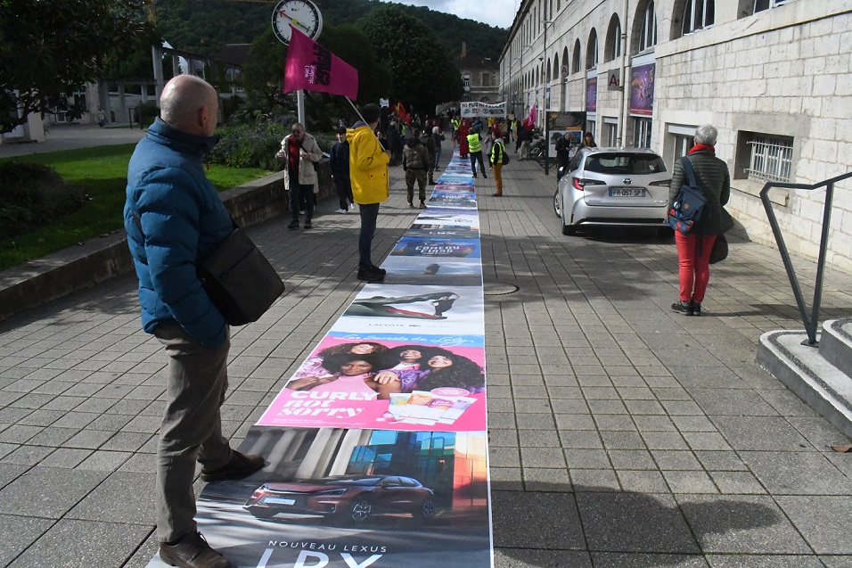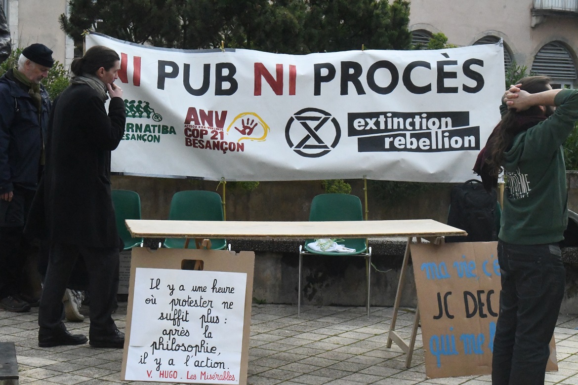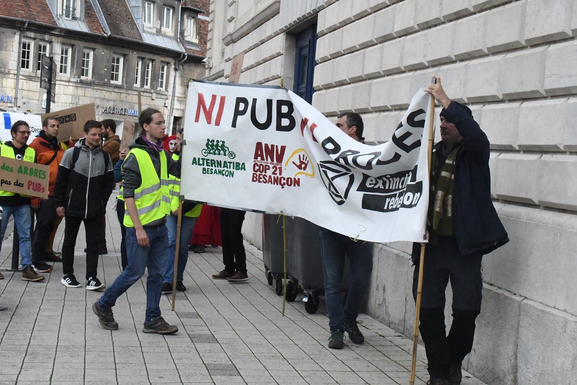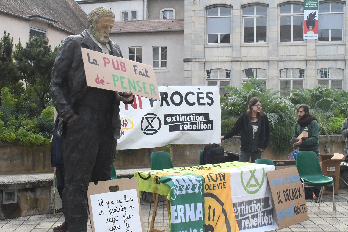 Des militants des collectifs ANV Cop21, Extinction Rébellion Besançon et Résistance à l’Agression Publicitaire se sont mobilisés ce vendredi matin, à Besançon, pour soutenir un militant anti-pub qui comparaît devant la justice suite à une action contre la publicité. Il est poursuivi par la justice suite à une plainte de l’entreprise JC Decaux. Ses soutiens s’opposent « fermement » à toute condamnation, « compte tenu de la légitimité de la lutte contre la publicité dans l’espace public et l’absence de dégâts matériels liés à son action ».
