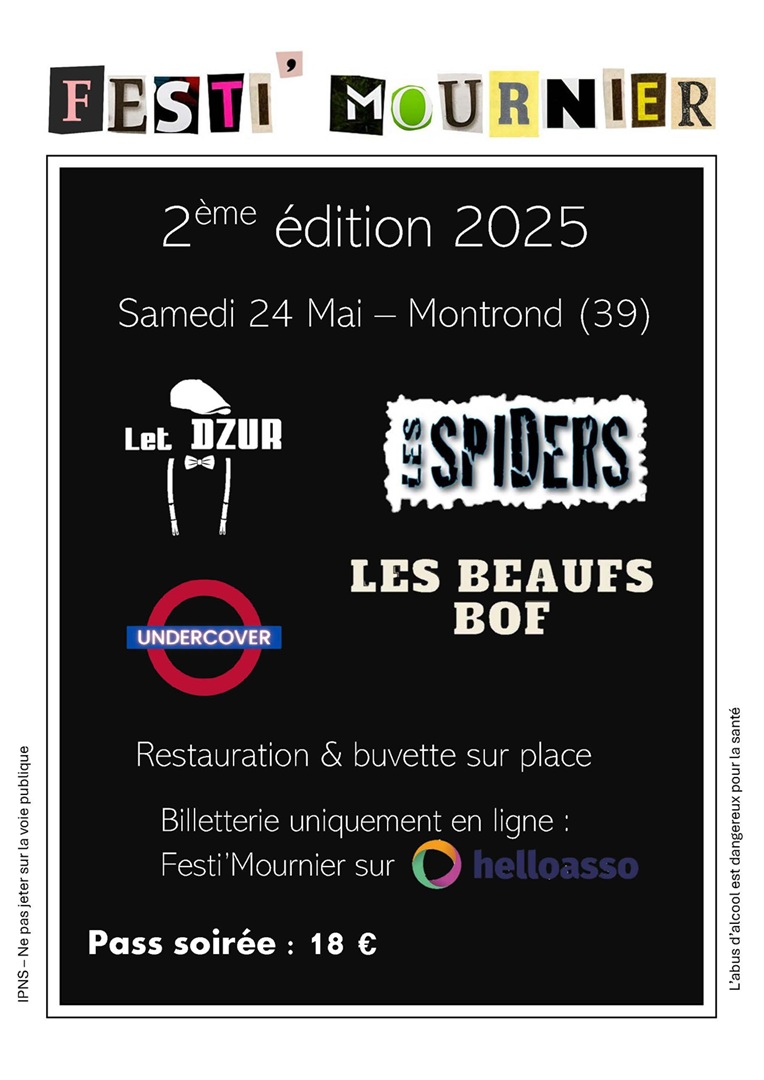 Après un premier succès éclatant, le Festi’Mournier, revient pour une deuxième édition qui promet d'enflammer le village avec une programmation toujours plus ambitieuse et festive. Rendez-vous ce samedi 24 mai, à partir de 18h, sur le stade de football de Montrond (39).