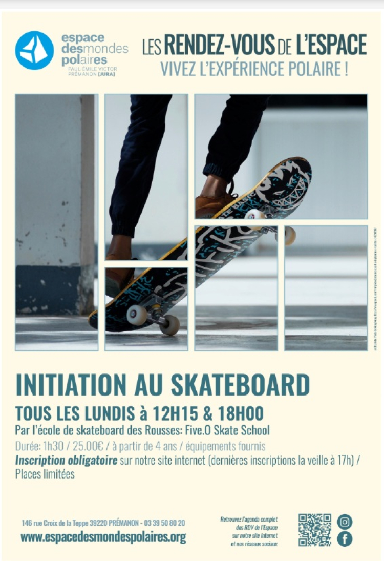 Jusqu’au 27 octobre, Five.O Skate, en partenariat avec l’Espace des Mondes Polaires de Prémanon, propose des sessions d’initiation au skateboard chaque lundi à 12h15 et 18h. Ouvert aux enfants dès 4 ans, l’activité inclut la mise à disposition de tout le matériel nécessaire : skateboard, casque et protections. L’utilisation d’un casque de vélo est autorisée.