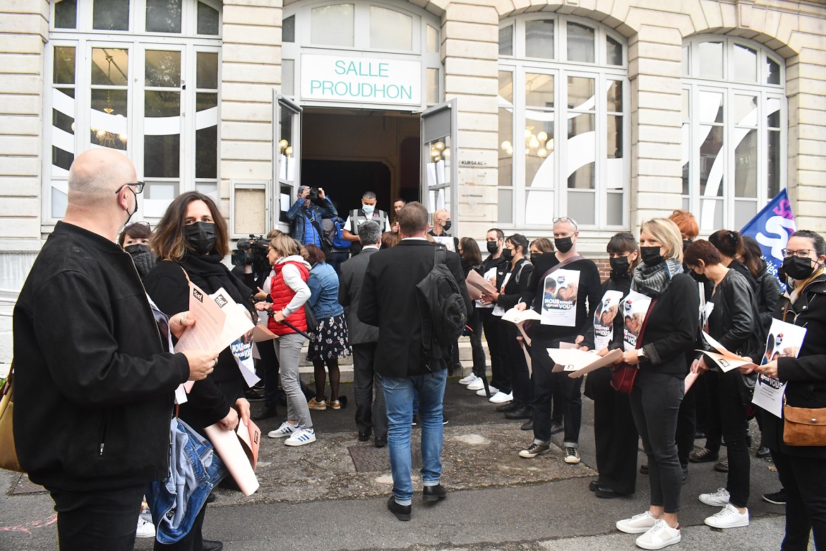 Ce mardi matin, à l’initiative de Sud Collectivités Territoriales, les travailleurs sociaux du CCAS de Besançon, de la Ville et de Grand Besançon Métropole se sont rassemblés devant le kursaal, où se tient le séminaire annuel des cadres. Ils étaient environ une trentaine.