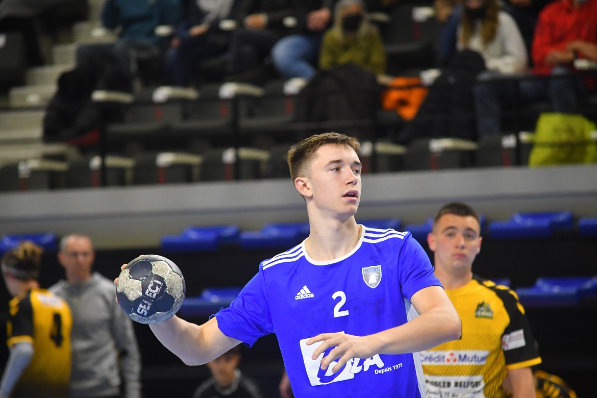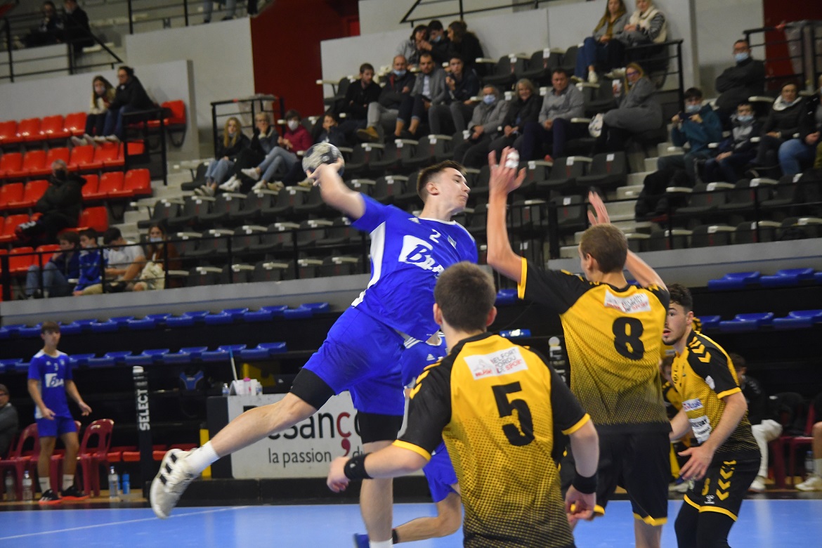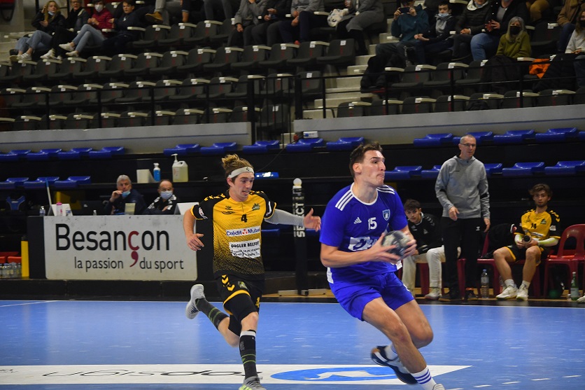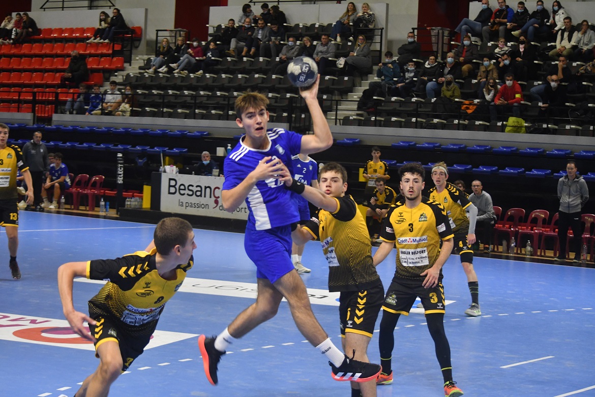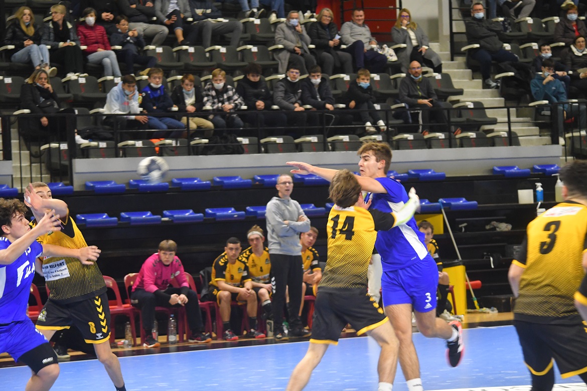 La victoire est nette et belle. Les U18 nationaux du Grand Besançon Doubs Handball ont confirmé ce dimanche après-midi ce qui était plus qu’une éventualité. Effectivement, grâce à leur domination sur Belfort, les Bleus sont désormais mathématiquement assurés de disputer le tableau haut du championnat de France. Ce jour, sur leur parquet, ils n’ont pas fait dans la dentelle en atomisant leur voisin franc-comtois sur le score de 41 à 22. Karim Bensedira, le coach bisontin, calme et décontracté sur le banc de touche, félicite ses joueurs.