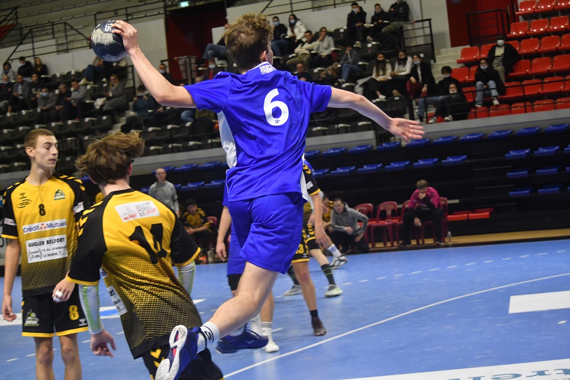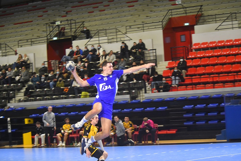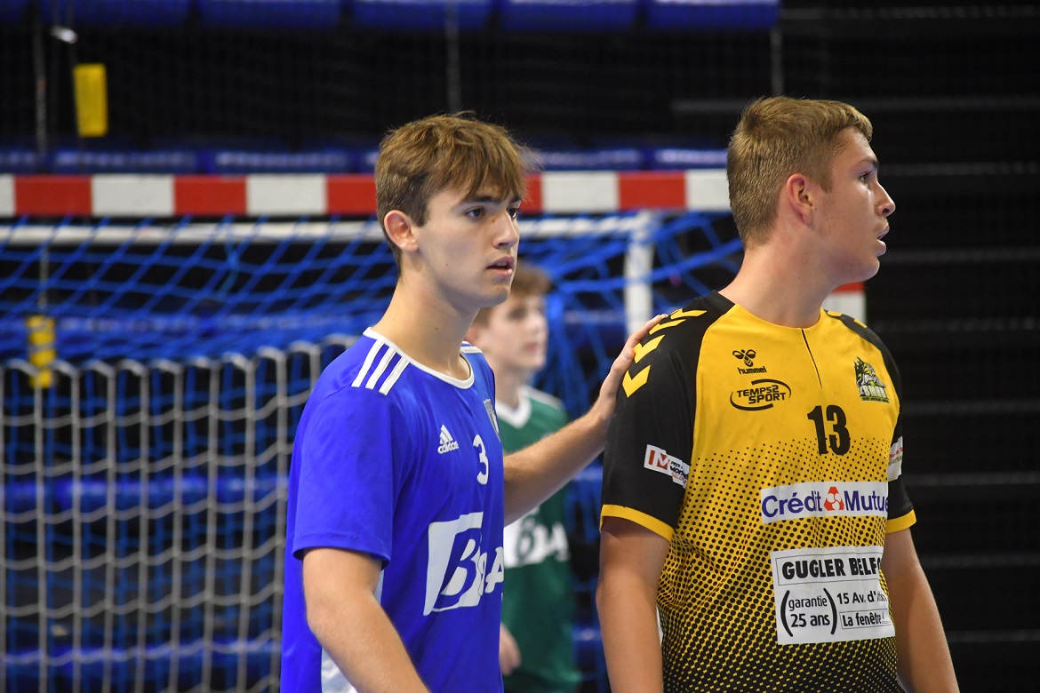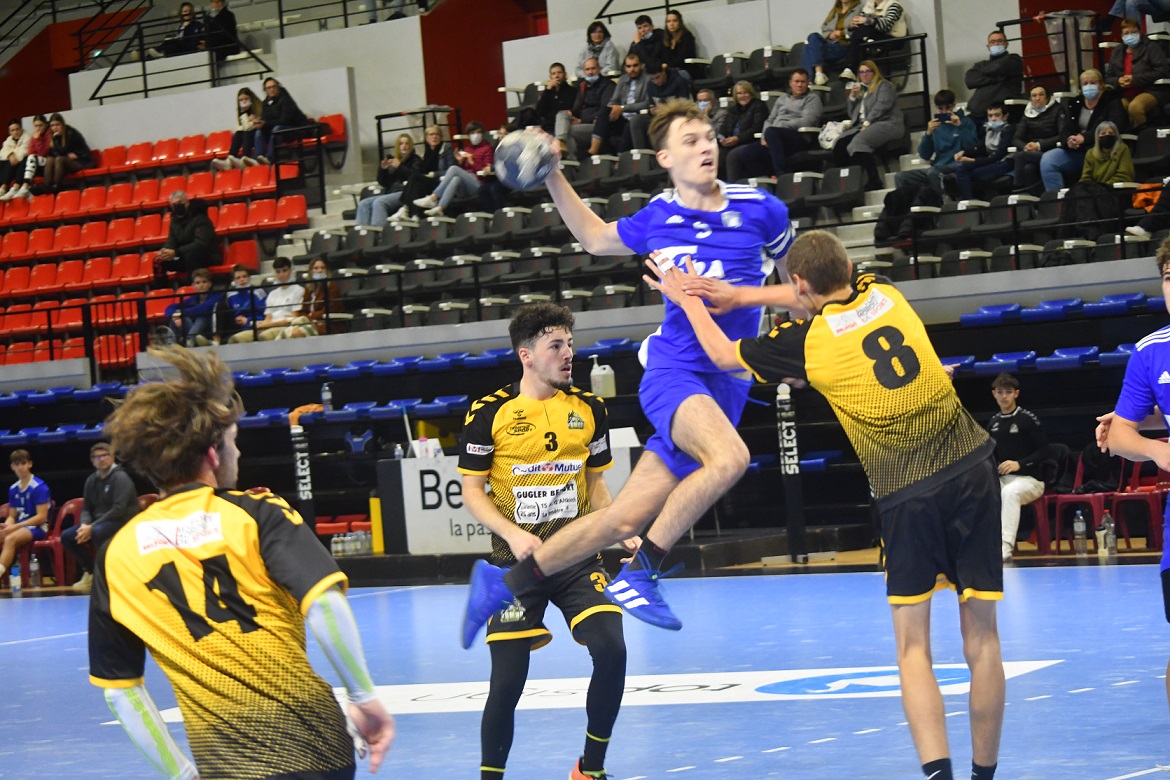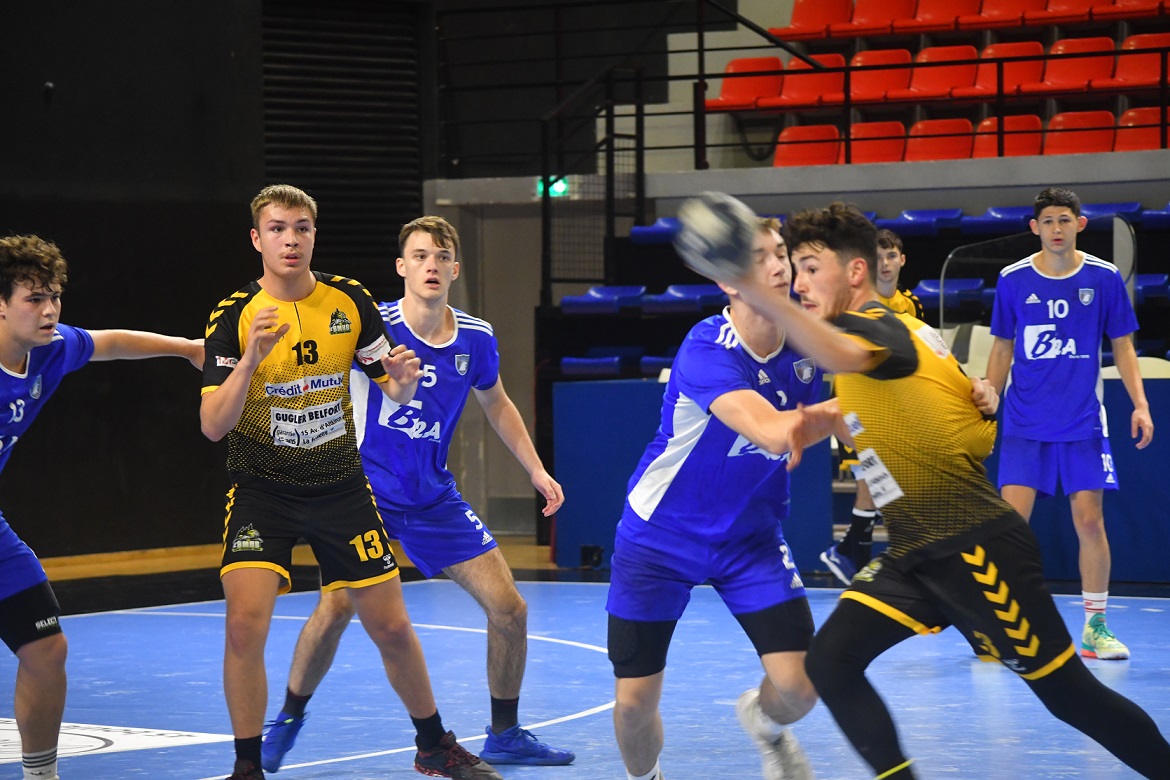 La victoire est nette et belle. Les U18 nationaux du Grand Besançon Doubs Handball ont confirmé ce dimanche après-midi ce qui était plus qu’une éventualité. Effectivement, grâce à leur domination sur Belfort, les Bleus sont désormais mathématiquement assurés de disputer le tableau haut du championnat de France. Ce jour, sur leur parquet, ils n’ont pas fait dans la dentelle en atomisant leur voisin franc-comtois sur le score de 41 à 22. Karim Bensedira, le coach bisontin, calme et décontracté sur le banc de touche, félicite ses joueurs.