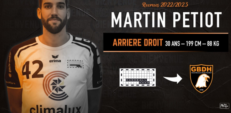 Le Grand Besançon Doubs Handball tient sa nouvelle recrue. Martin Petiot (30 ans / 199 cm / 88 kg), qui arrive du club d’Esch Handball, qui évolue en D1 masculine au Luxembourg, portera les couleurs bisontines la saison prochaine. Il a évolué durant trois saisons au sein de ce collectif. Il vient de s’engager jusqu’en 2024 avec le GBDH.