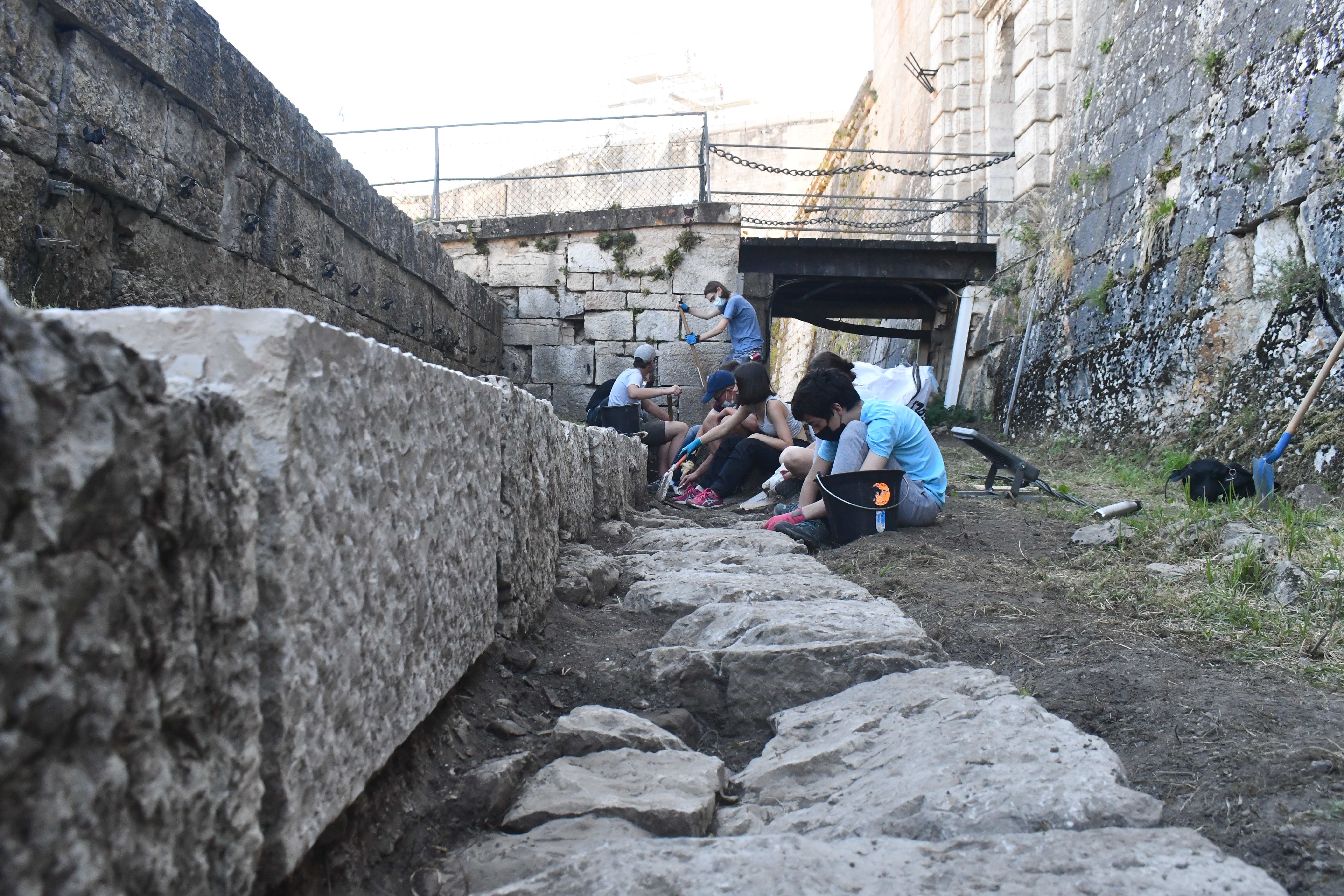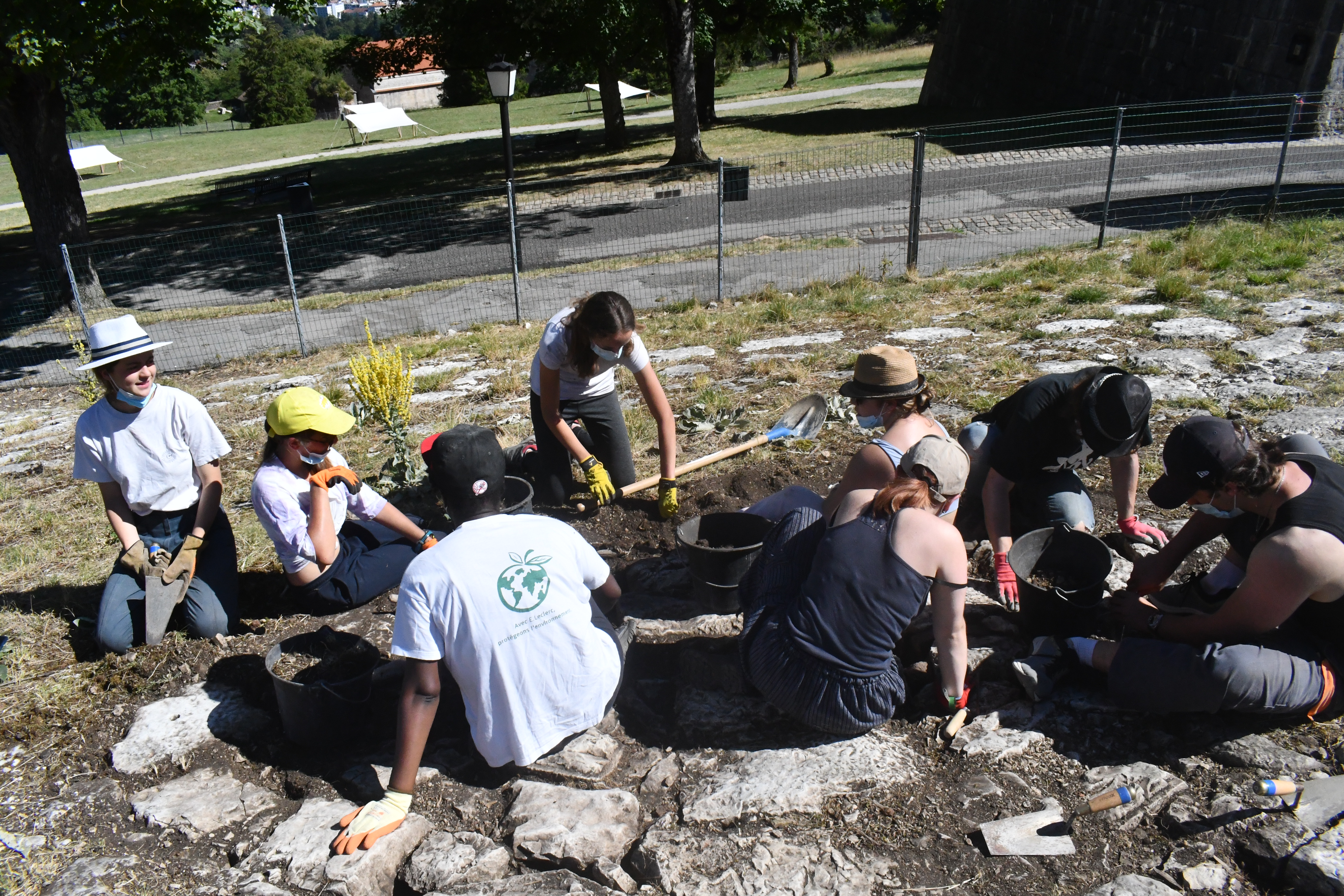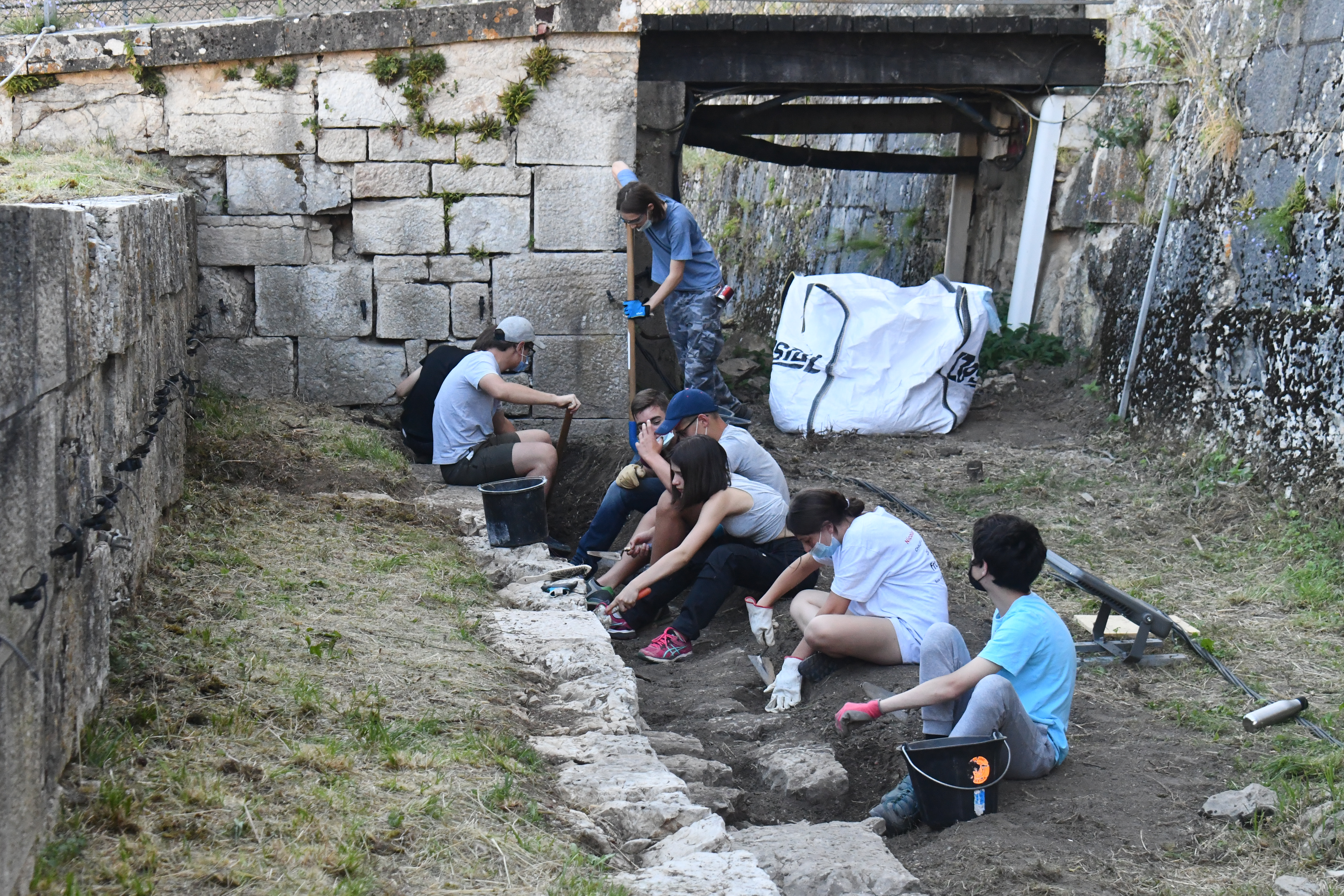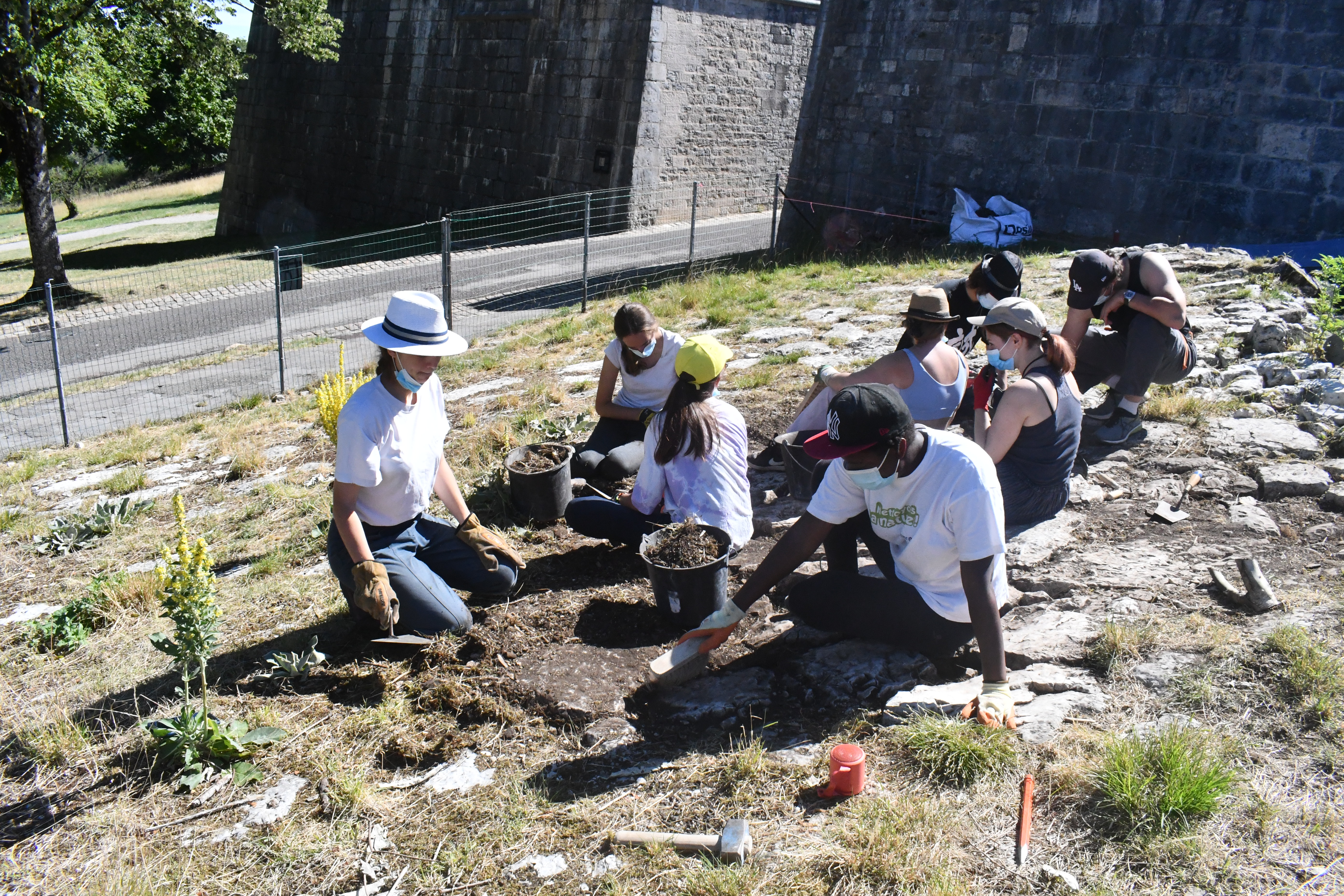 Jusqu’au 24 juillet, la vingtaine de jeunes présents sur le monument de Vauban sont répartis en trois groupes et travaillent près de 5h par jour, sur des sites parfois cachés du regard des visiteurs. Leurs principales missions : dévégétaliser et remettre en valeur un pavage Vauban caché, dévégétaliser et rejointoyer un mur d’artillerie, et terminer l’ouverture d’un accès près de l’orillon 79, un mur en pierres sèches, dont la tête de mur va être achevée. Il s’agit d’un chantier commencé il y a deux ans, et cette restauration va permettre d’ouvrir cette partie au public.
