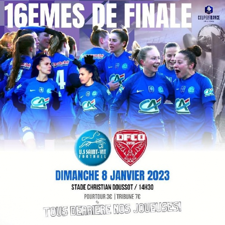 Le sport féminin sera à l’honneur en fin de semaine en Franche-Comté. Les Saint-Vitoises disputent les 16ès de finale de la Coupe de France féminine de football ce dimanche 8 janvier à 14h30 au stade d’honneur Christian Doussot. Le groupe est déterminé plus que jamais pour écrire une nouvelle belle page dans l’histoire du club. Une place en 8è de finale lui tend les bras. Pour ce faire, il faudra se débarrasser des Dijonnaises. La rencontre ne s’annonce pas des plus faciles face à cette formation qui évolue dans l’élite du football français.