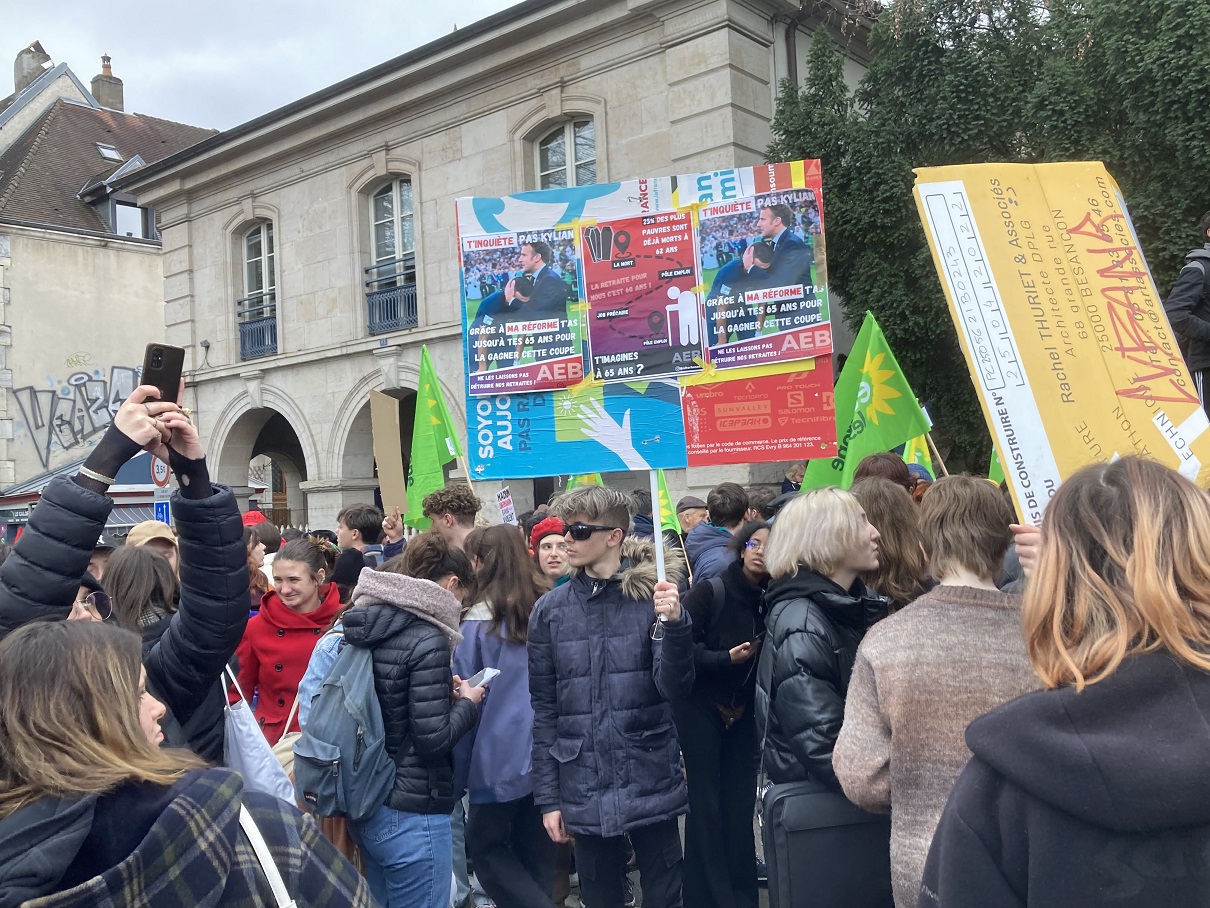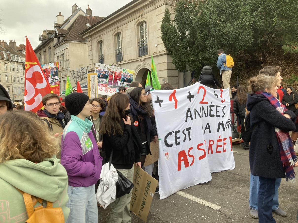 A Besançon, de nombreux étudiants ont fait le déplacement pour exprimer leur mécontentement. Ces jeunes se mobilisent pour leurs parents ou grands-parents, mais aussi pour eux et leur avenir de futurs actifs. « Je pense à mon grand-père qui a perdu la vie peu de temps après avoir pris son droit à la retraite » explique Théo. Marina est également venue exprimer ses inquiétudes. « La situation des femmes » l’inquiète tout particulièrement. « Cette réforme est tout sauf égalitaire » appuie-t-ell. Loïs, lui aussi, est venu enrichir les rangs avec ses camarades de la fac de lettres. « La mobilisation directe est la seule béquille que nous avons pour valoir notre voix ».