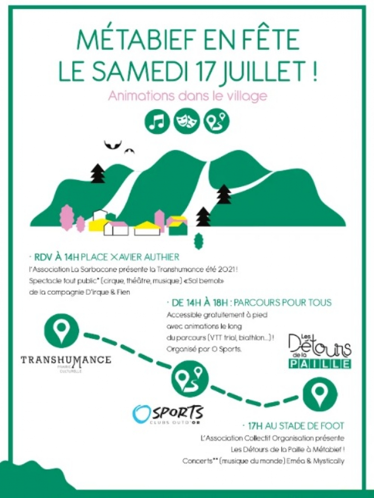 A 17h, au stade de foot de Métabief : concerts de musique du monde, en extérieur en format debout : MYSTICALLY & EMÉA. Les Détours de la Paille finissent en beauté, venez profiter du grand air à Métabief pour vous évader sur des airs de musiques du monde ! Billetterie en vente en ligne. Ces concerts seront également filmés et diffusés en différé sur les réseaux du Festival de la Paille.