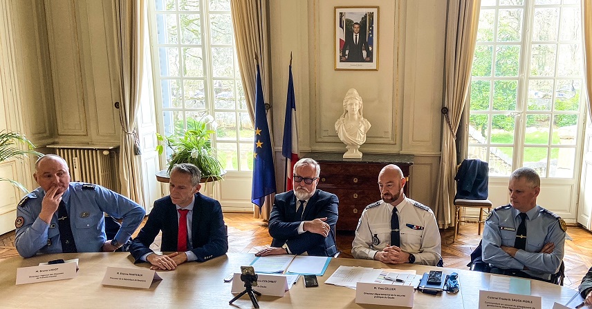 Aux côtés de Jean-François Colombet, le préfet du Doubs, Etienne Manteaux, procureur de la République de Besançon, Yves Cellier, directeur de la direction départementale de la sécurité publique, Bruno Ligiot, directeur régional de douanes de Franche-Comté ainsi que le colonel Frédérik Sauge-Merle, commandant en second du groupement de gendarmerie départemental du Doubs.
