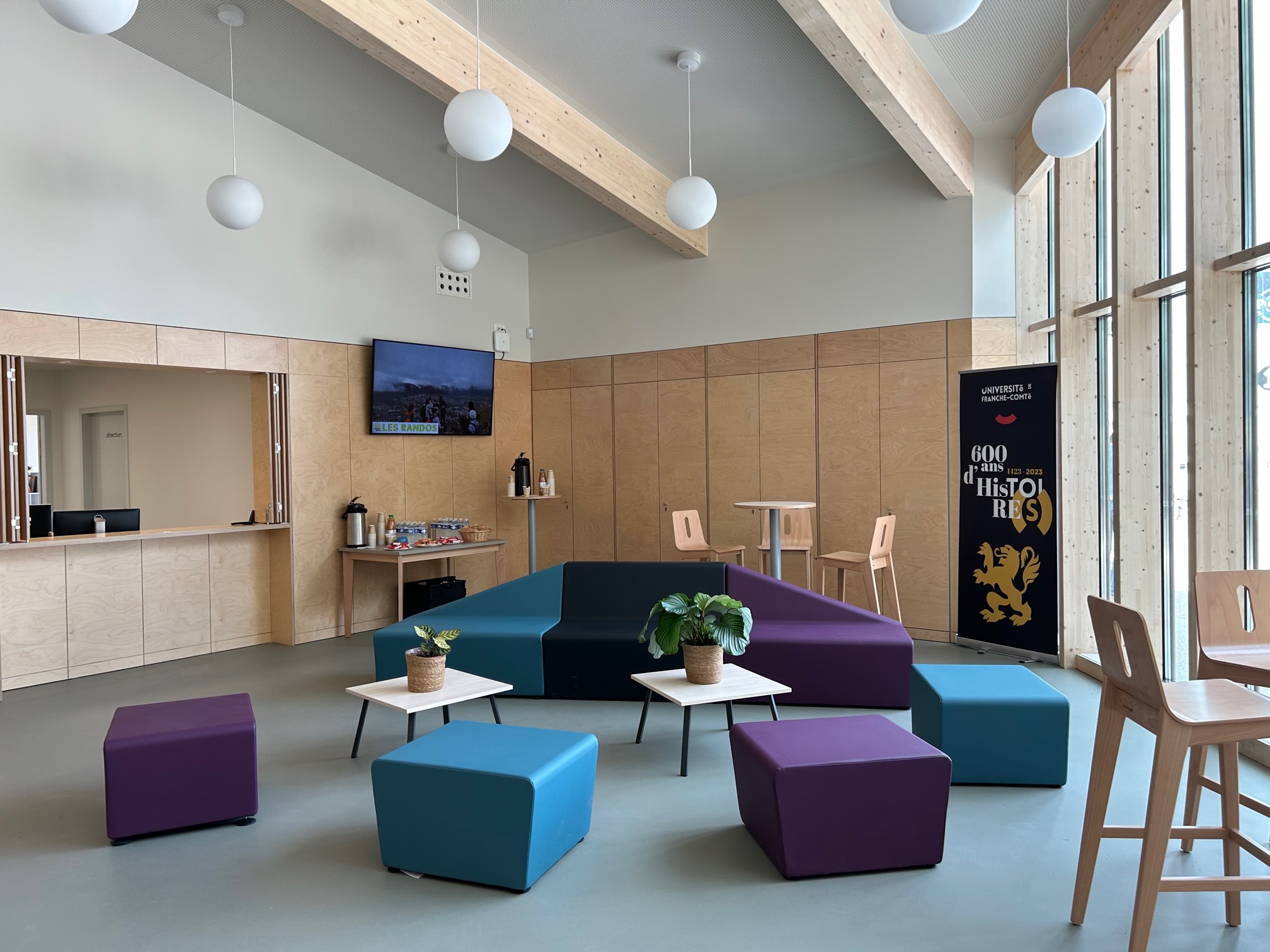 Par ailleurs, ce campus accueille désormais la Maison Campus Sport, un lieu fédérateur qui propose des bureaux, des salles de réunion et des espaces de travail sur 300m². Trois structures dédiées à l’accueil des étudiants sont hébergées dans le hall de cette maison : le service universitaire des activités physiques et sportives, la Ligue régionale du sport universitaire, ainsi que l’ASUFC, association sportive étudiante. Cette structure, faite d’une ossature en bois, est conçue en matériaux biosourcés et répond aux exigences d’un bâtiment passif grâce à une meilleure isolation et une bonne orientation. Montant des études et des travaux : 1,3 millions d’euros.