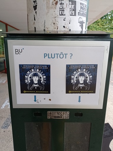 L’Alternative Etudiante Besançon nous alertait en début d’après-midi. Cette nuit, le collectif féministe identitaire d’extrême-droite « Némésis » a vandalisé la bibliothèque universitaire Proudhon, à Besançon. Plus d’une centaine de stickers et plusieurs tags xénophobes ont été appliqués à l’entrée de la bibliothèque.