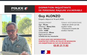 La police de Besançon lance un avis de recherche pour une disparition inquiétante. M. Guy Alonzo, âgé de 76 ans, n’a plus donné signe de vie depuis ce 14 avril. Il a quitté son domicile, situé à Besançon, entre minuit et 06h30, ce jour. Son téléphone portable a été retrouvé à l’intérieur de son domicile.