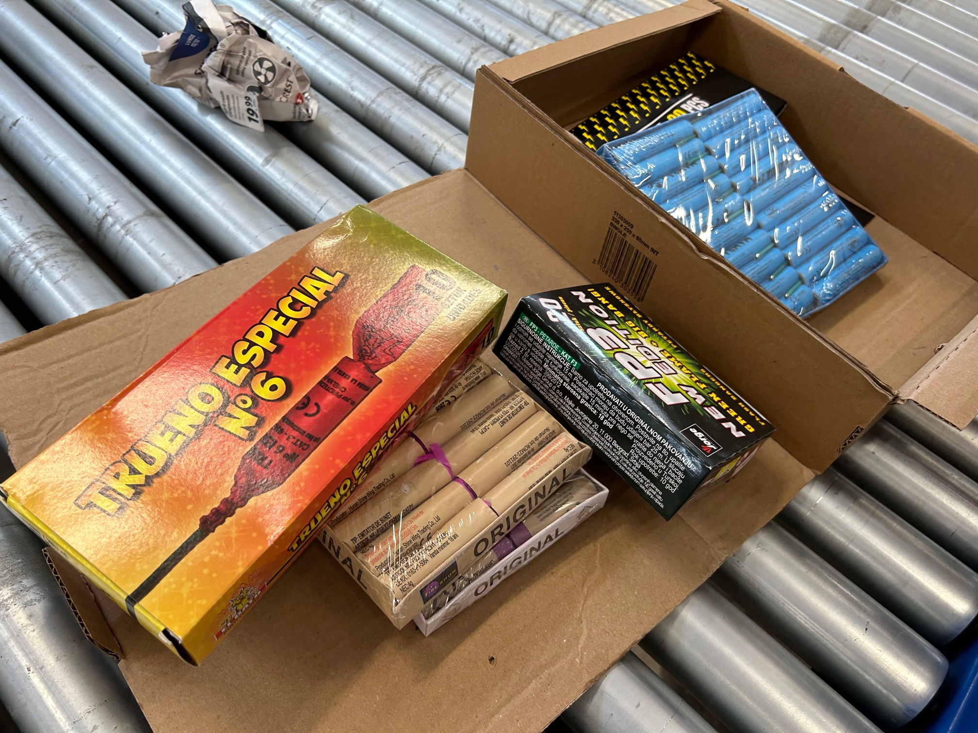 Sous un temps orageux dépassant les 30°, la chaleur règne au sein de l’entrepôt. Les gouttes de sueur coulent le long des visages, les jeunes travailleurs intérimaires enchaînent les bouteilles d’eau fraîche, Marki le labrador a la gueule ouverte, laisse trainer sa langue. « Par ces temps très chauds, son autonomie est diminuée et on le fait travailler bien moins longtemps qu’à l’accoutumée » indique son maître. Mais les colis se suivent et se succèdent toujours. « Et voilà ! » s’écrie soudainement un douanier au loin. « Mortier ! » ajoute-t-il. Très vite, son équipe se masse autour de lui, les caméras s’approchent. L’agent dévoile son butin. Une caisse remplie de multiples articles pyrotechniques, sans justificatif national et sans facture, circulant en fret express, en provenance de Pologne. « Ce ne sont pas des gros pétards, mais ils produisent beaucoup d’étincelles et font énormément de bruit. Ils peuvent aussi être utilisés pour confectionner des engins explosifs de plus grande envergure » précise le douanier. Bien évidemment, l’intégralité de la marchandise est confisquée par les forces de l’ordre.