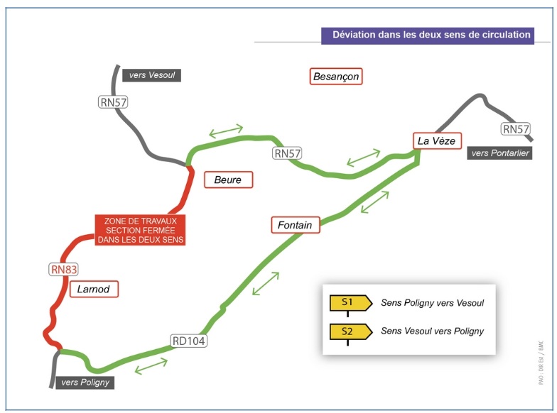 Les voies de gauche seront neutralisées dans les deux sens pendant les deux premiers jours, puis la circulation sera basculée sur la voie opposée. Les bretelles Besançon vers L’Hôpital-du-Grosbois et L’Hôpital-du-Grosbois vers Pontarlier seront fermées durant les quatre derniers jours. Des déviations seront mises en place.
