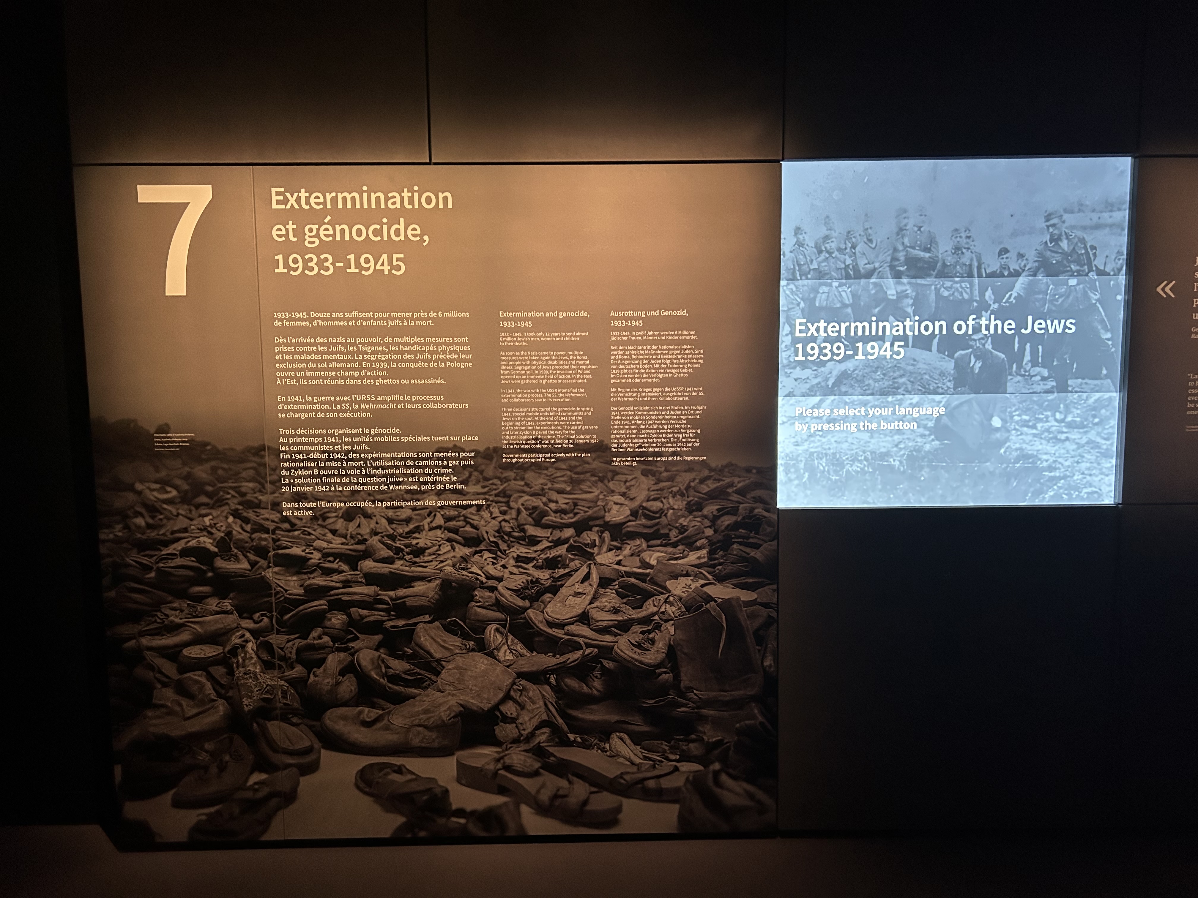 Centrée sur les deux problématiques « individus et sociétés en guerre » et « mots et langage », la nouvelle exposition permanente succédera à la précédente qui n'avait pas été renouvelée depuis plus de 35 ans. Sur un niveau et 10 salles, le parcours permettra à chaque visiteur d'aborder l'intégralité des thématiques : le projet nazi dans l'Europe des années 1930 ; l'effondrement de 1940 ; la France de 1940-1944 ; la déportation et l'extermination ; la Libération et l'après-guerre.