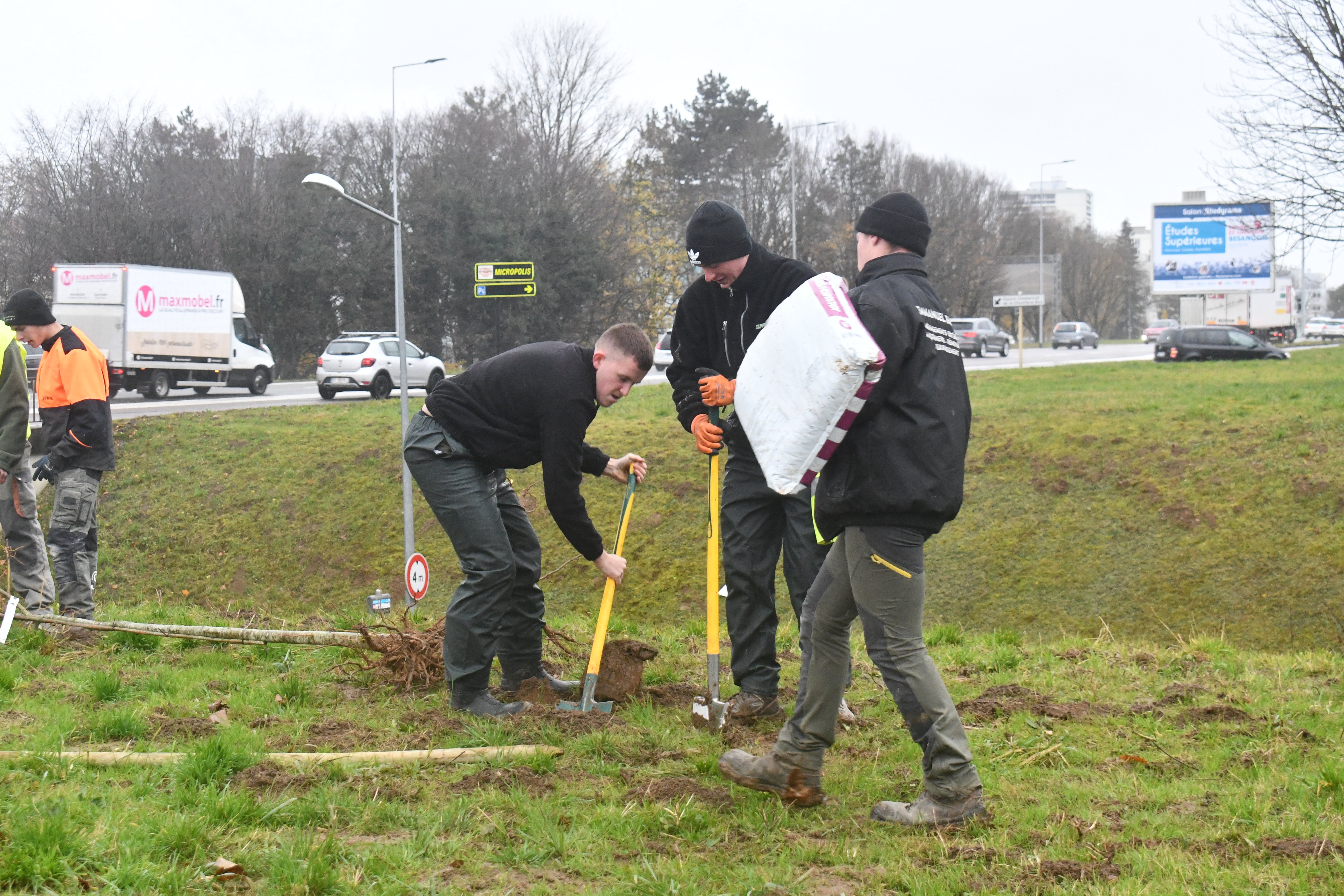 L’Association Ecologique et Forestière Franc-Comtoise organisait dans le cadre de son projet « Les petits fruitiers pour l’avenir », une plantation d’arbres et d’arbres fruitiers ce mercredi sur la zone herbeuse au bord de la rue Einstein, à côté de la chaufferie bois.