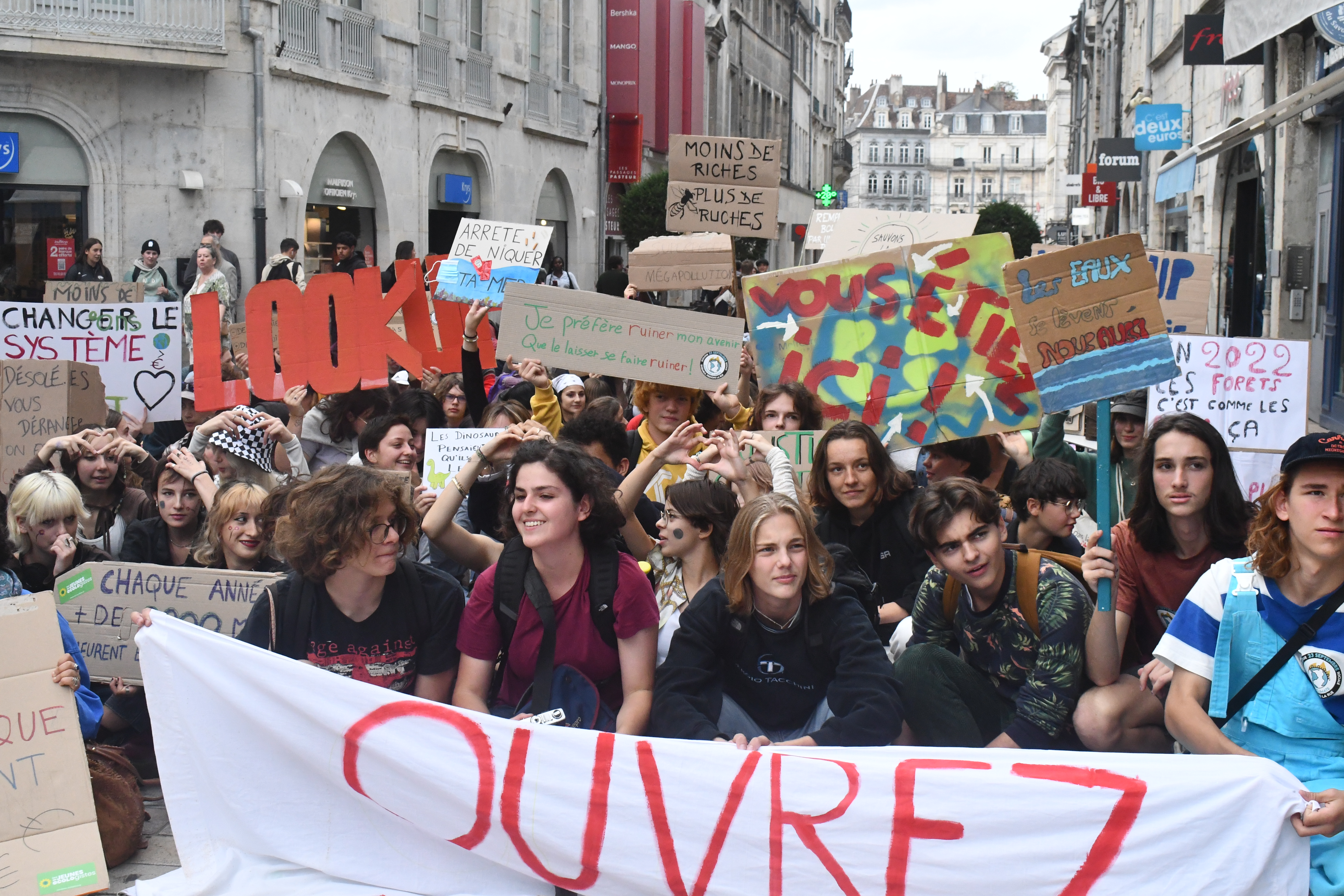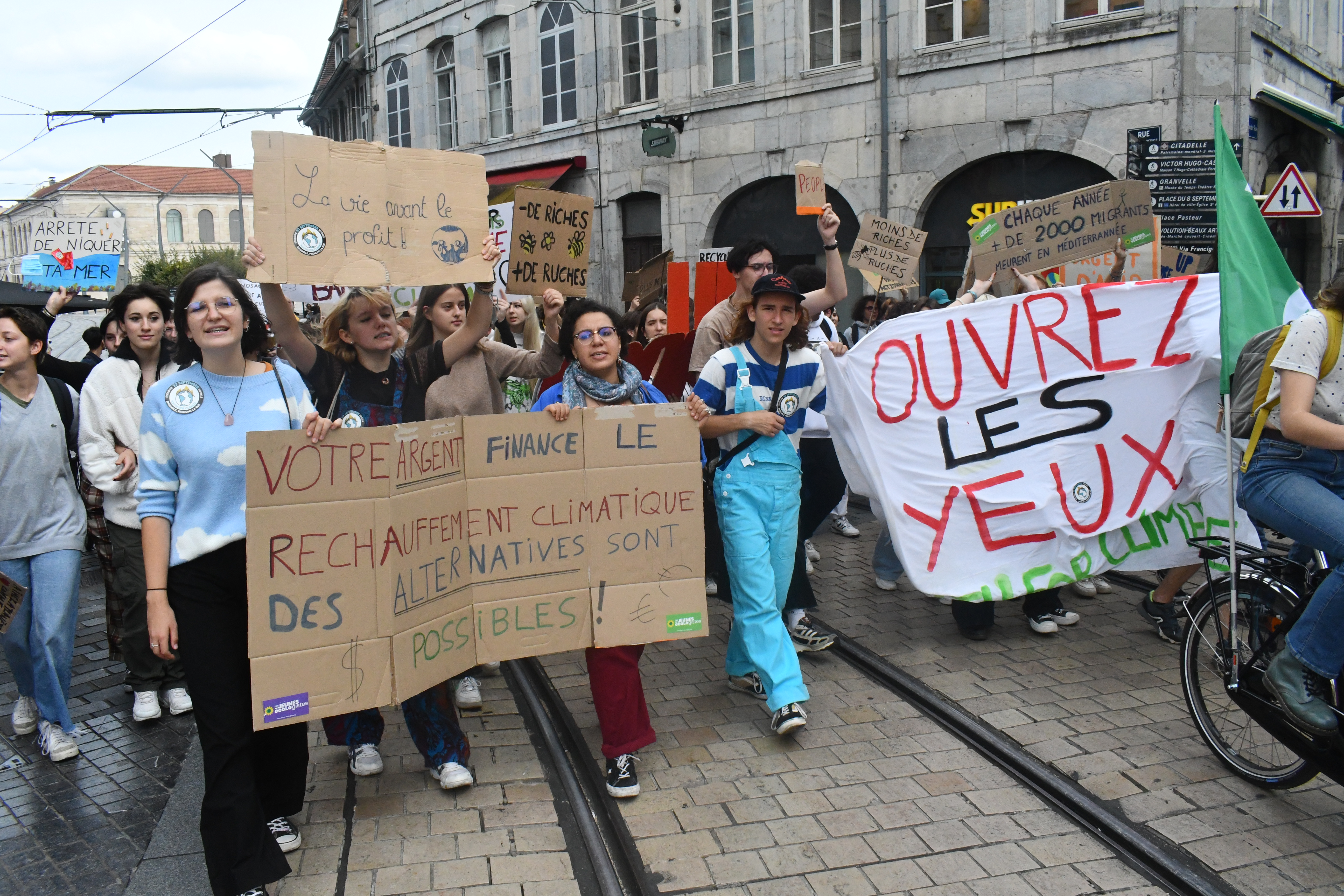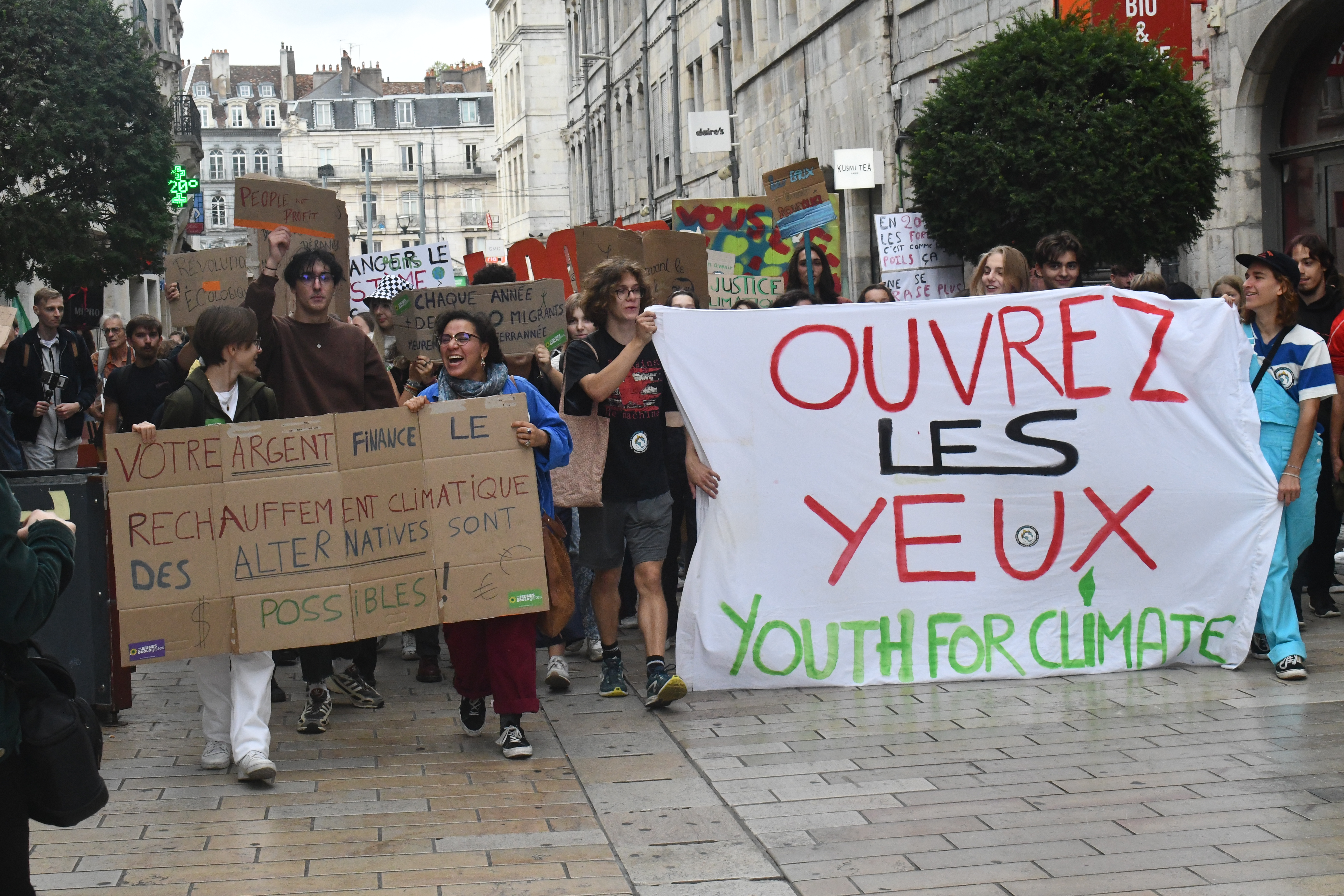 Ce vendredi à Besançon, plusieurs mouvements citoyens et associations se sont mobilisés place de la Révolution pour tenir une marche pour le climat. Le rendez-vous était fixé à 14h. Une soixantaine de personnes ont répondu à cet appel. Dans le cortège, l’AEB Section Lycéenne, Alternatiba ou encore Extinction Rébellion. Les organisations appelaient chacun et chacune à se mobiliser au côté de la jeunesse pour réclamer de "réelles actions climatiques". Les manifestants ont déambulé dans le centre-ville bisontin tout en scandant différents slogans relatifs au climat, mais aussi parfois en direction des forces de l’ordre. Arrivés face à la Banque BNP Paribas, rue des Granges, le cortège a entamé un sit-in au milieu de la route pendant plusieurs minutes. La manifestation a ensuite repris sa route dans une ambiance plutôt festive et sans débordement. Dans le cortège, de nombreux jeunes, « très inquiets de l’avenir » et « en colère face à un gouvernement qui néglige complétement l’écologie et l’environnement ». Selon ces manifestants, « la situation est déjà critique, et il devient urgent d’agir, de prendre les mesures nécessaires, et de rapidement changer de cap ». Des propos soutenus et partagés par des participants un peu plus âgés. « C’est une catastrophe, on fonce droit dans le mur […] Je ne me fais pas de souci pour moi, je suis à la retraite, mais je m’inquiète pour mes enfants, et mes petits-enfants, qui devront vivre dans ces conditions, dans ce monde qu’on leur laisse » explique ce militant d’Alternatiba.